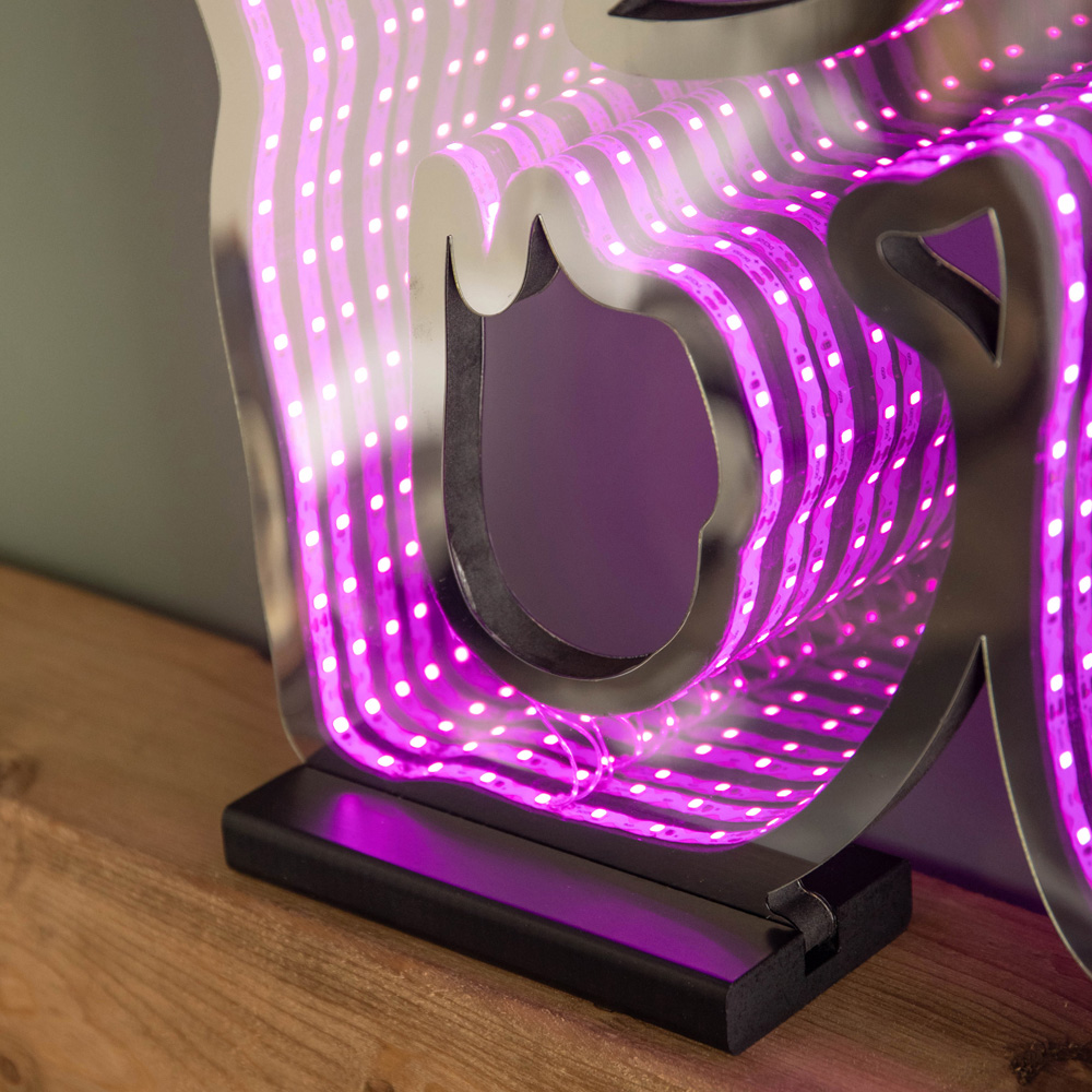 Transform your holiday decor with this stunning Halloween BOO infinity led light decoration. Infinity lights are a modern mirror effect using light to create an illusion of depth and a repeating light pattern. This simple yet mesmerising light up display is thin whilst creating this amazing 3D effect as you view the light from different angles. Create a eerie display and a talking point for anyone visiting your home. Suitable to be placed on most flat surfaces such as a mantle piece, windowsill or by the front door to spook any visitors this year. Featuring an infinity mirror with Pink and White LEDs, this creates the never ending reflection of the spooky light when lit up. The decoration sits on a wooden base and is mains operated with a generous 3m clear cable from product to plug. Quick and easy to set up, just simply peel the film off the mirror then attach the base and plug in. Suitable for indoor use only. Product Dimensions: Height: 38cm. Length 60cm. Stand: 15 x 7cm. Cable Length: 3m.