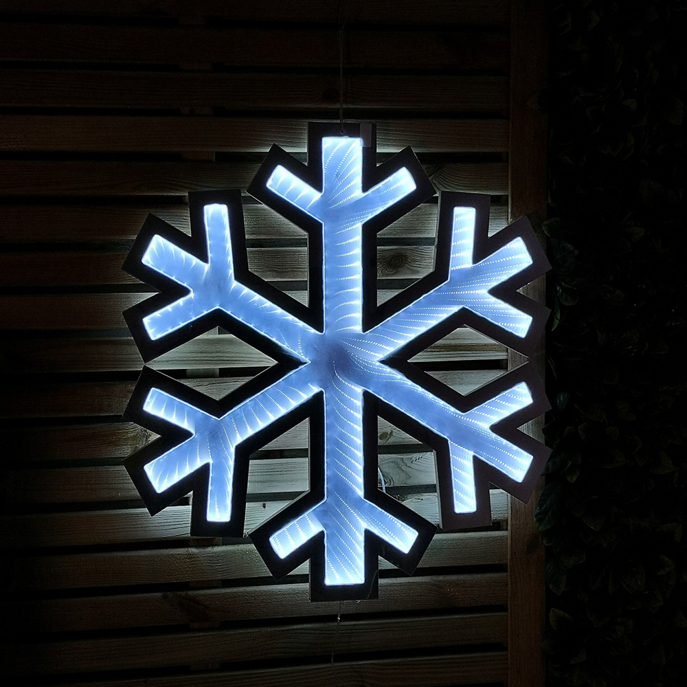 Transform your holiday decor with this stunning Samuel Alexander Infinity Light Up Hanging Snowflake Christmas Decoration 60cm. Infinity lights are a modern mirror effect using light to create an illusion of depth and a repeating light pattern. This simple yet mesmerising light-up display is thin, making this amazing 3D effect as you view the snowflake from different angles. Create a festive display and a talking point for all your family and guests. Suitable to be hung anywhere around your home such as the garden fence, above the fireplace or to create a dazzling window display to welcome visitors this year. Featuring an infinity mirror with white LEDs, this creates the never-ending reflection of the snowflake when lit up. The snowflake decoration is mains operated with a generous 3m clear cable from the product to the plug. Quick and easy to set up, just simply peel the film off the mirror and plug it in. Suitable for indoor use and sheltered outdoor use. Product Dimensions Height: 60cm Length: 57cm Cable Length 3m