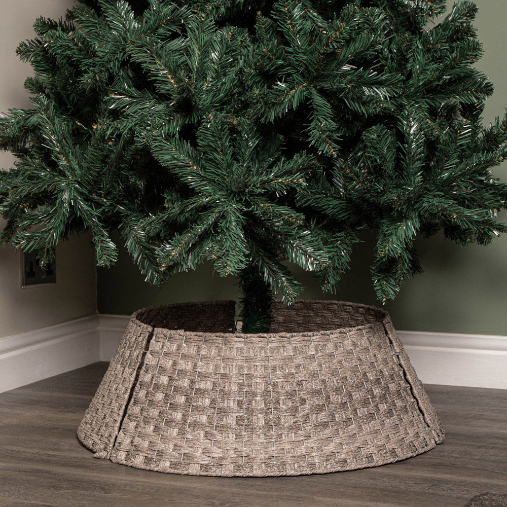 Add a touch of elegance to your holiday decor with the Samuel Alexander KD Large Grey Plastic Wicker Rattan Christmas Tree Skirt 24 x 70cm. This stylish accessory encircles the base of your tree, enhancing its appearance by concealing unsightly metal or plastic stands, making artificial trees look more realistic. Historically, tree skirts served to protect floors from wax drippings and fallen needles while providing a festive backdrop for presents. This tree skirt is crafted from a metal frame and a plastic rattan woven body. It comes in three sections that clip together to form a complete collar and can be easily dismantled for convenient storage. Ensure you measure your tree stand for proper sizing. The medium skirt has external dimensions of a top diameter of 48cm, a bottom diameter of 70cm, and a height of 24cm.