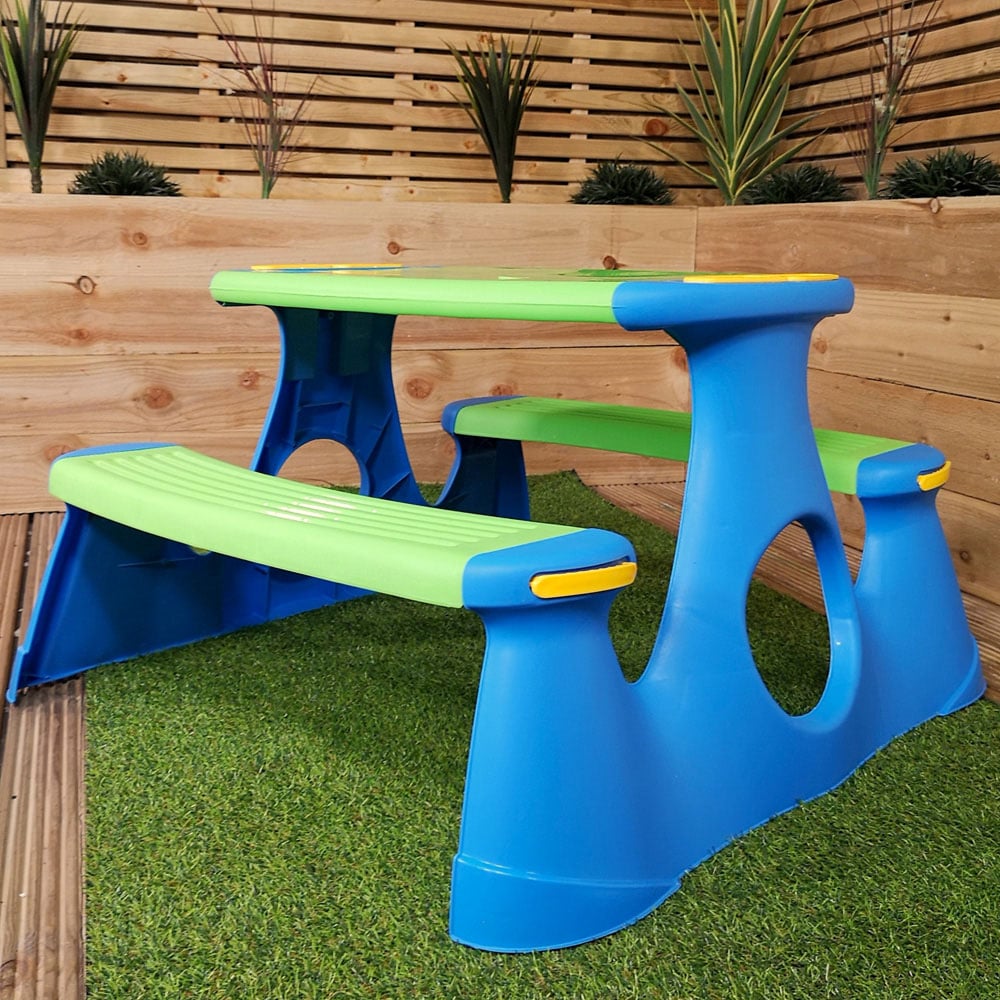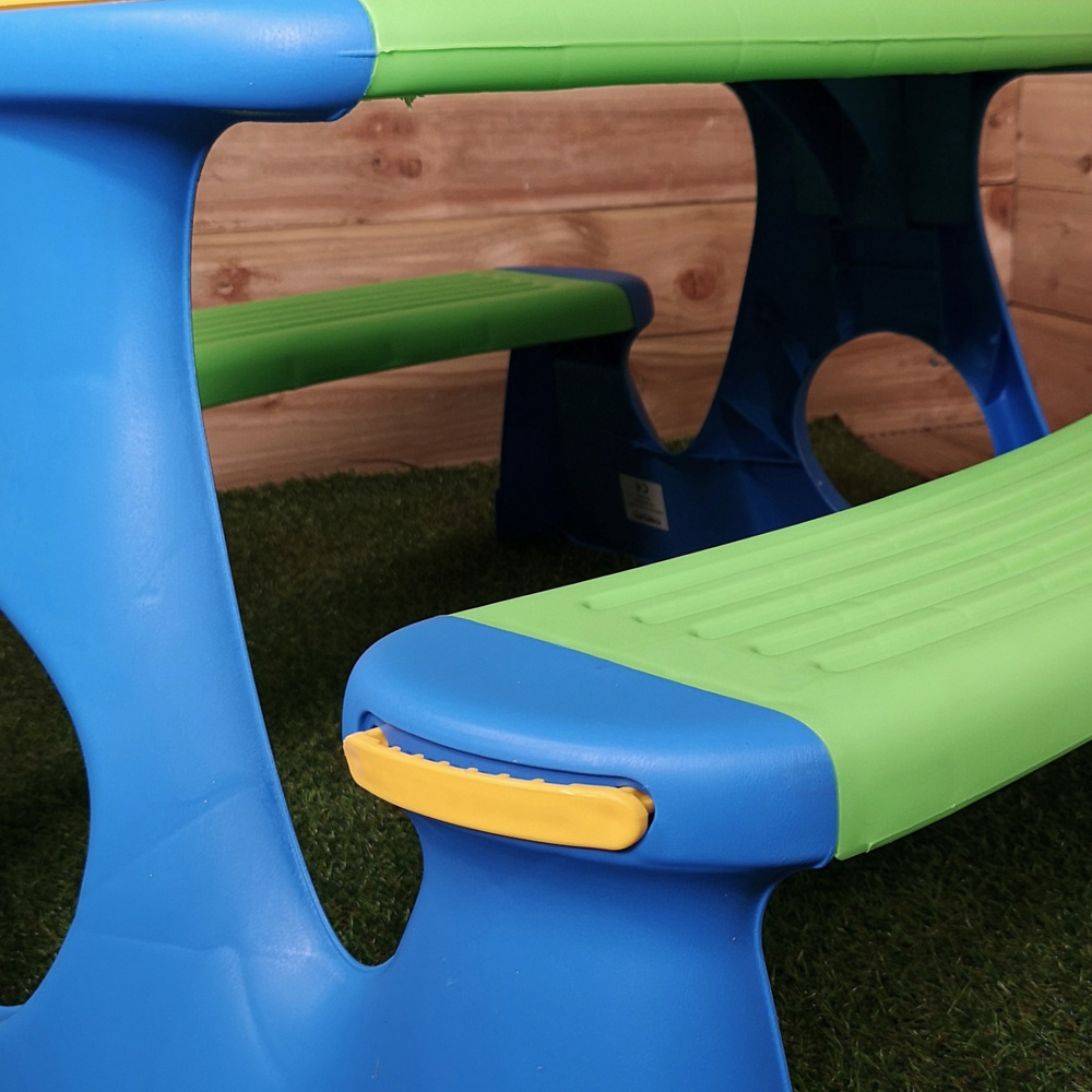 Let your children have fun outdoors with this Samuel Alexander Kids Plastic Picnic Table and Bench. Crafted from strong, durable plastic, this table and bench is weatherproof and offers anti-uv properties to help prevent its colour from fading. It can seat up to four children, so there's plenty of room for playdates. This table also features a hole for a parasol, so you can use it to create shade on those sunny days. With vibrant colours, this table helps stimulate children's imagination and makes outdoor playtime even more fun. Note: This table requires self-assembly - pieces snap together and will be ready within minutes. Simply wipe clean with a damp cloth to keep this looking new for years to come. Suitable for 18 months and over. Dimensions: H48 x W89.5 x L84.5cm.