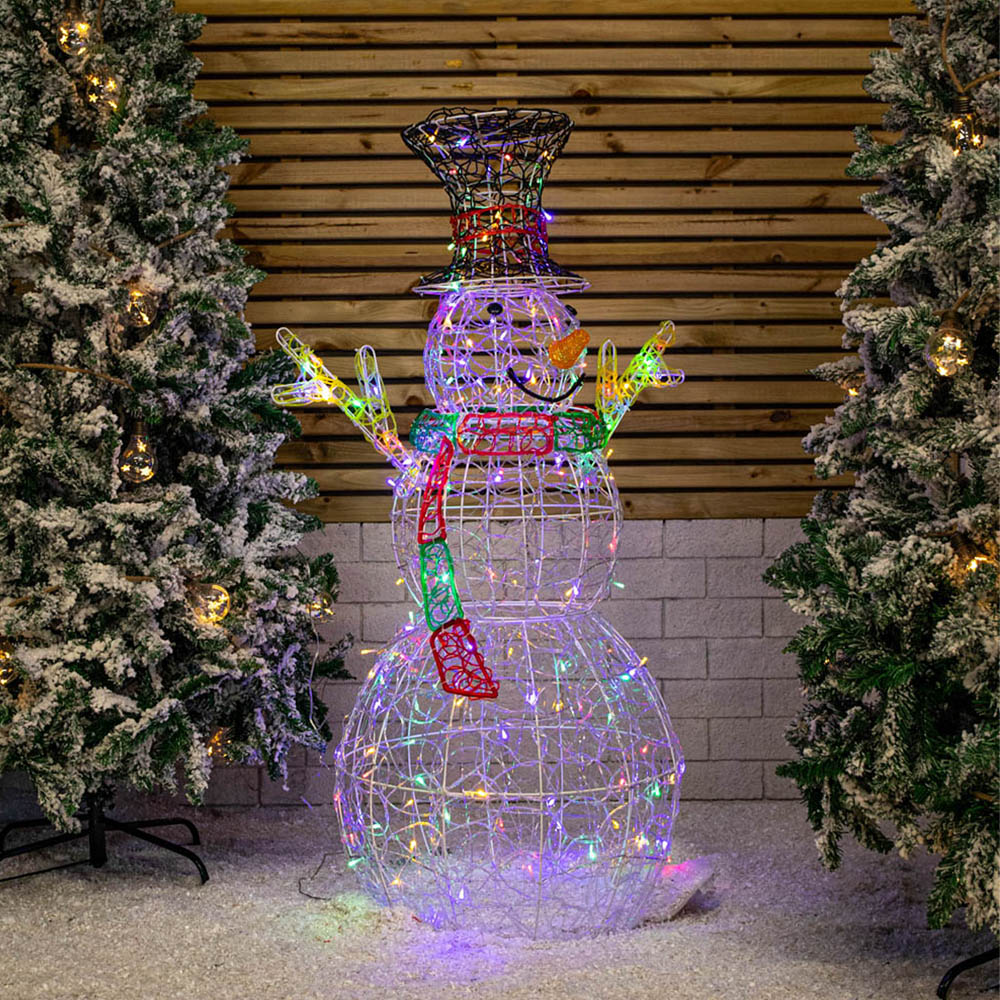 Illuminate your home this Christmas with this soft acrylic Snowman. This stunning light decoration will look great as part of a festive display or a stand-alone piece whether you place the snowman by the front door to welcome any visitors or in the garden to create a dazzling display. The snowman decoration is made with soft, clear acrylic with a white metal frame and features 160 multi-coloured, static LED lights. This decoration is sure to bring the festive spirit to your home this year. The snowman decoration requires some assembly, just simply slot each section into place and plug in. Mains operated with a generous 5 meter clear cable from product to transformer allowing you to plug this in with plenty of wire. Suitable for indoor and outdoor use (plug must remain indoors) Product Dimensions Height: 130cm Width: 74cm Depth: 50cm Lead Length: 5m.