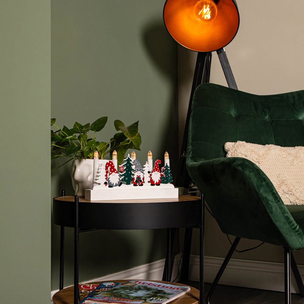 Create a warm, inviting holiday atmosphere with this Samuel Alexander Light Up White Wooden Christmas Candle Bridge with Gonk Scene. Symbolising a welcoming home, it brings a classic charm and soft, enchanting glow to your space. Measuring 14cm x 5cm x 28cm, it is just the right size for any flat indoor surface. Its white wooden frame holds five white candles, each illuminated by warm white LEDs that create a cosy ambience. Behind each candle sits a charming scene featuring three Gonks wearing festive clothing and holding candy canes and presents with snowy trees, adding to its seasonal appeal. Battery operated by two AA batteries that are not included, it can easily be placed anywhere without messy wires and plugs. It's perfect for bringing a touch of tradition to your indoor holiday decor.