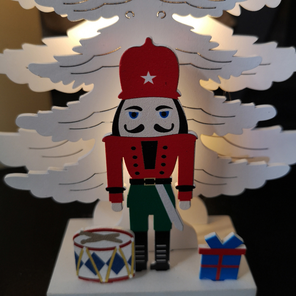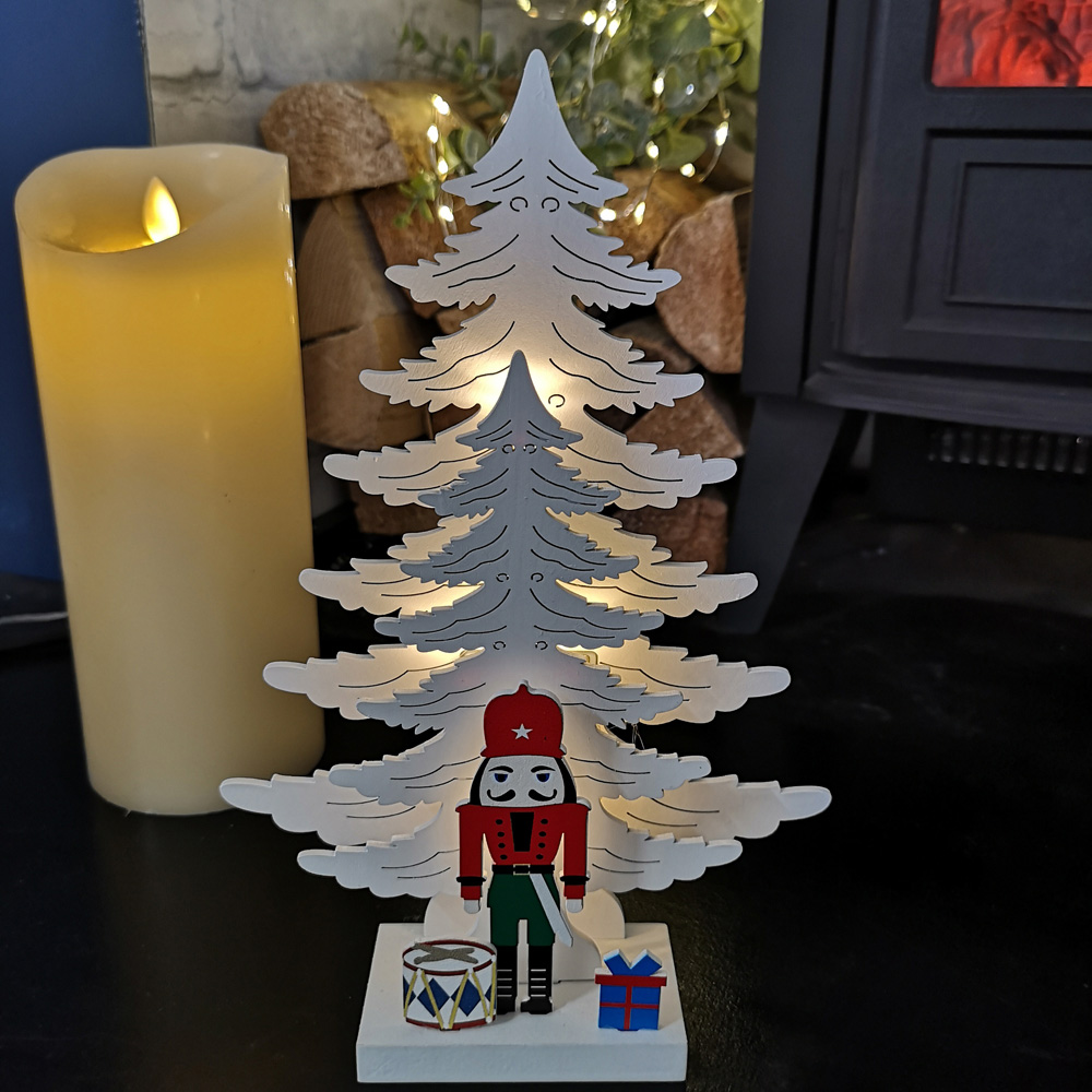 Make this season sparkle with the Samuel Alexander Nutcracker LED Decoration with White Wooden Christmas Tree. This enchanting light-up Nutcracker wooden scene is perfect as part of a holiday display or as a standalone piece to brighten any room. Dressed in classic soldier attire, the Nutcracker stands proudly with a drum and Christmas present beside him, framed by two elegant white Christmas trees. With five warm white LED lights, this battery-operated decoration brings a cosy glow to any mantelpiece, windowsill or tabletop. It requires two AAA batteries which are not included, and the bulbs are non-replaceable. It is suitable for indoor use only.