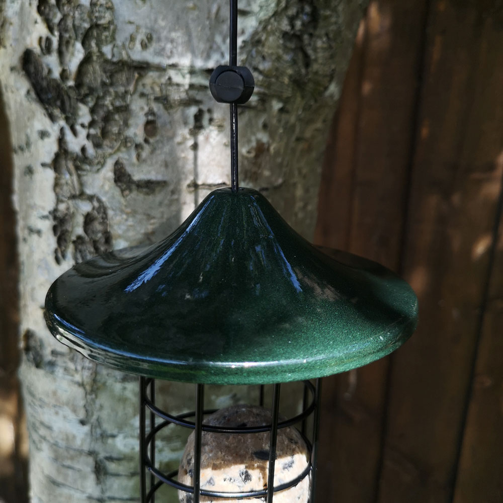 Invite the flying visitors into your garden with the Samuel Alexander Oriental Garden Wild Bird Fat Ball Feeder. It features a stylish oriental design and a robust speckled green metal lid with a metal hanging loop. It has an easy-lift lid with a toggle for filling according to your convenience. It also features a sturdy mesh with a large feeding tray that allows easier feeding for birds. You can attract a variety of wild birds by placing this feeder in your outdoor space. Feed not included. Approximate dimensions: 21cm x 13cm.