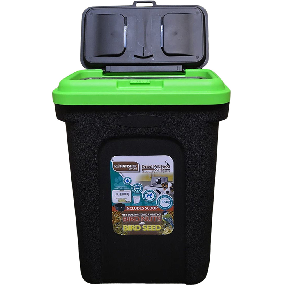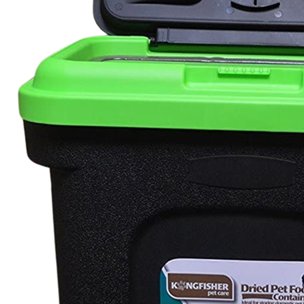 Strong Plastic Pet Food Storage Tub. Hinged Lid with snap lock closure. Includes a food scoop seated on the underside of the lid so it is always to hand. Made from high-density polyethene.