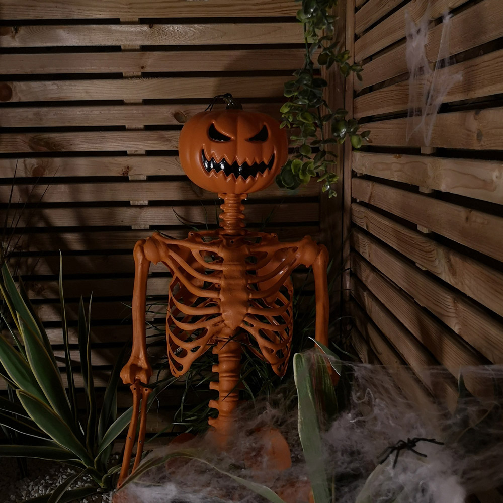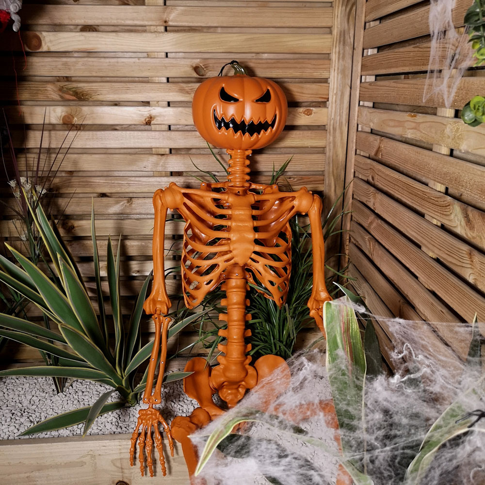 Make your home Halloween-ready with the Samuel Alexander Posable Pumpkin Skeleton Halloween Decoration 5ft. Made using durable plastic, this decoration has movable joints that let you pose it the way you like and suit your Halloween decor perfectly. It wears an orange finish to add an authentic touch to your Halloween scene and is suitable for indoor and outdoor use. Plus, it comes with a black hanging string for easy set-up. Whether it's suspended from a ceiling, wall, or tree or hidden in a doorway or porch, this decoration is sure to add a spooktacular touch to your home. Note: The head does not move. This skeleton cannot stand upright on its own and is for decorative purposes only. Size: H150 x L39 x W27cm.