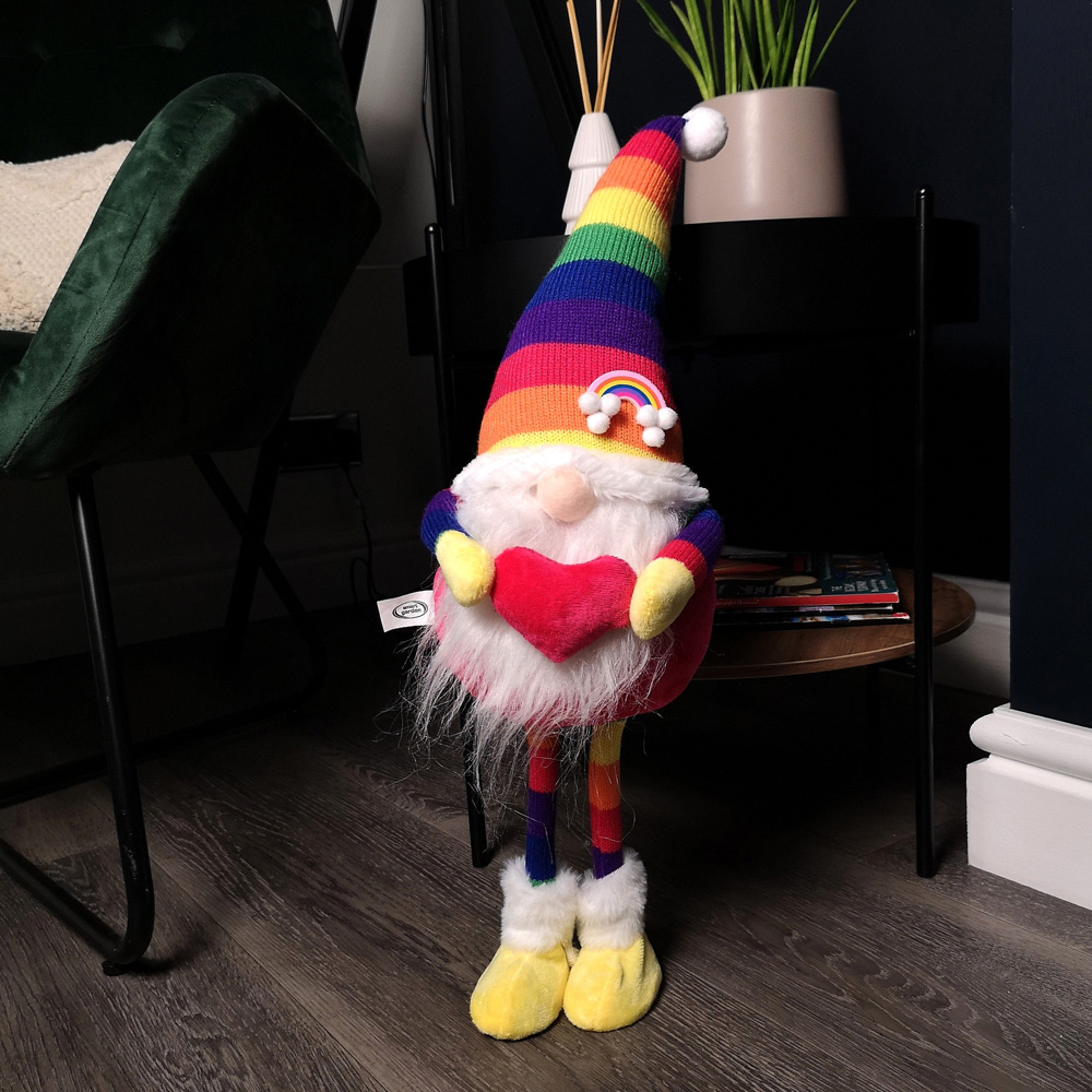 Brighten up your home this festive season with Samuel Alexander Rainbow Standing Gonk Plush Christmas Decoration. This charming Gonk is an ideal addition to your indoor space as a stand alone piece or part of a festive display. These curious little creatures are said to take a liking to houses in the colder seasons and if treated well they offer protection and bring good luck within the home. This attractive Gonk features a striped Rainbow design with a hat to match whilst holding a Red love heart and a plush body that's soft to the touch. Perfect for adding those warm finishing touches to the Christmas décor or a companion gift to that someone special this Christmas and is suitable for indoor use only. Dimensions H55 x W15cm.