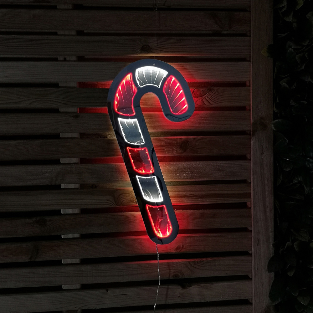 Transform your holiday decor with this stunning hanging candy cane infinity LED light decoration. Infinity lights are a modern mirror effect using light to create an illusion of depth and a repeating light pattern. This simple yet mesmerising light-up display is thin whilst creating this amazing 3D effect as you view the candy cane from different angles. Create a festive display and a talking point for all your family and guests. Suitable to be hung anywhere around your home such as the garden fence, above the fireplace or to create a dazzling window display to welcome visitors this year. Featuring an infinity mirror with red and white LEDs, this creates the never-ending reflection of the candy cane when lit up. The decoration is mainly operated with a generous 3m clear cable from the product to the plug. Quick and easy to set up, just simply peel the film off the mirror and plug it in. Suitable for indoor use and sheltered outdoor use. Product Dimensions Height: 89cm. Length: 19cm. Cable Length 3m.