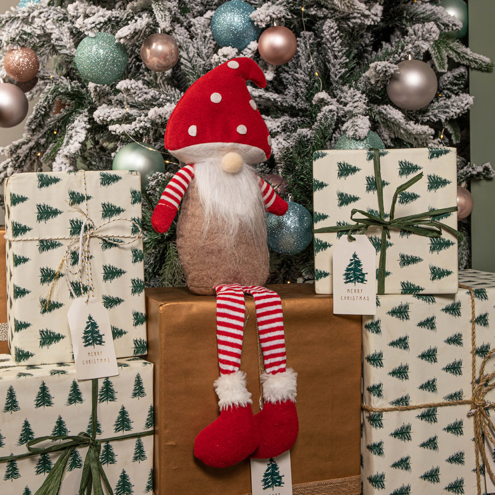 Bring home the festive spirit with Samuel Alexander Red and White Mushroom Hat Sitting Gonk Christmas Decoration 53cm. This charming Red and White Gonk is an ideal addition to your indoor space and suitable for most flat surfaces. These curious little creatures are said to take a liking to houses in the colder seasons and if treated well they offer protection and bring good luck within the home. This attractive Gonk's hat is in the style of a Red and White spotted mushroom with a plush body that's soft to the touch. The Gonk has dangly legs with Red and White fur trimmed boots. Perfect for adding those warm finishing touches to the Christmas decor or a companion gift to someone special this Christmas. The material is surface washable and is suitable for indoor use only. Dimensions H53 (from feet to hat) H30cm (from seat to hat) x L20cm.
