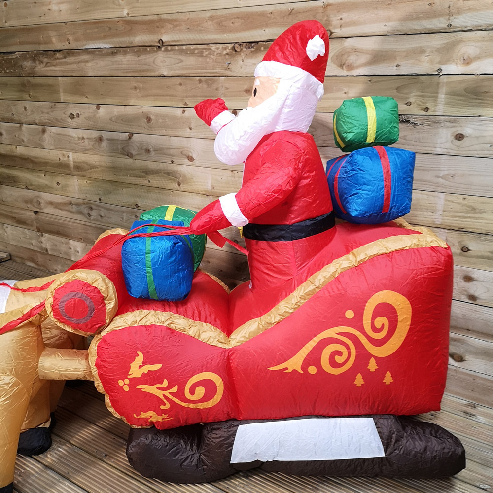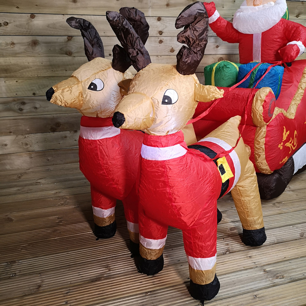 Celebrate the holidays with this Samuel Alexander Santa Sleigh and Reindeer Light Up Inflatable Christmas Decoration 8ft. Standing 8ft tall, it features a long Santa Sleigh with his two Reindeers celebrating the holidays, creating a festive centrepiece. With built-in LED lights, it lights up beautifully for nighttime displays, making it a charming addition indoors or outdoors. Easy to set up, it comes with a low-power, eco-friendly transformer that must be kept indoors or in a weatherproof socket.