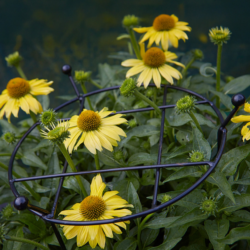 Value pack of two Tom Chambers Cottage range large grow through plant supports. Perfect way to support most herbaceous plants and shrubs. Strong and sturdy support with ball finial detail. Crafted from strong heavy duty metal steel and coated in weatherproof black plastic. Can be left in place over winter for next years plant growth. Size: 80cm high x 45cm diameter.