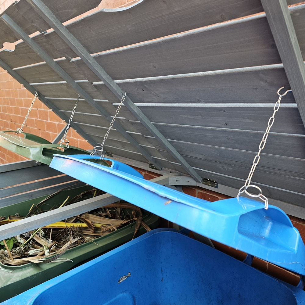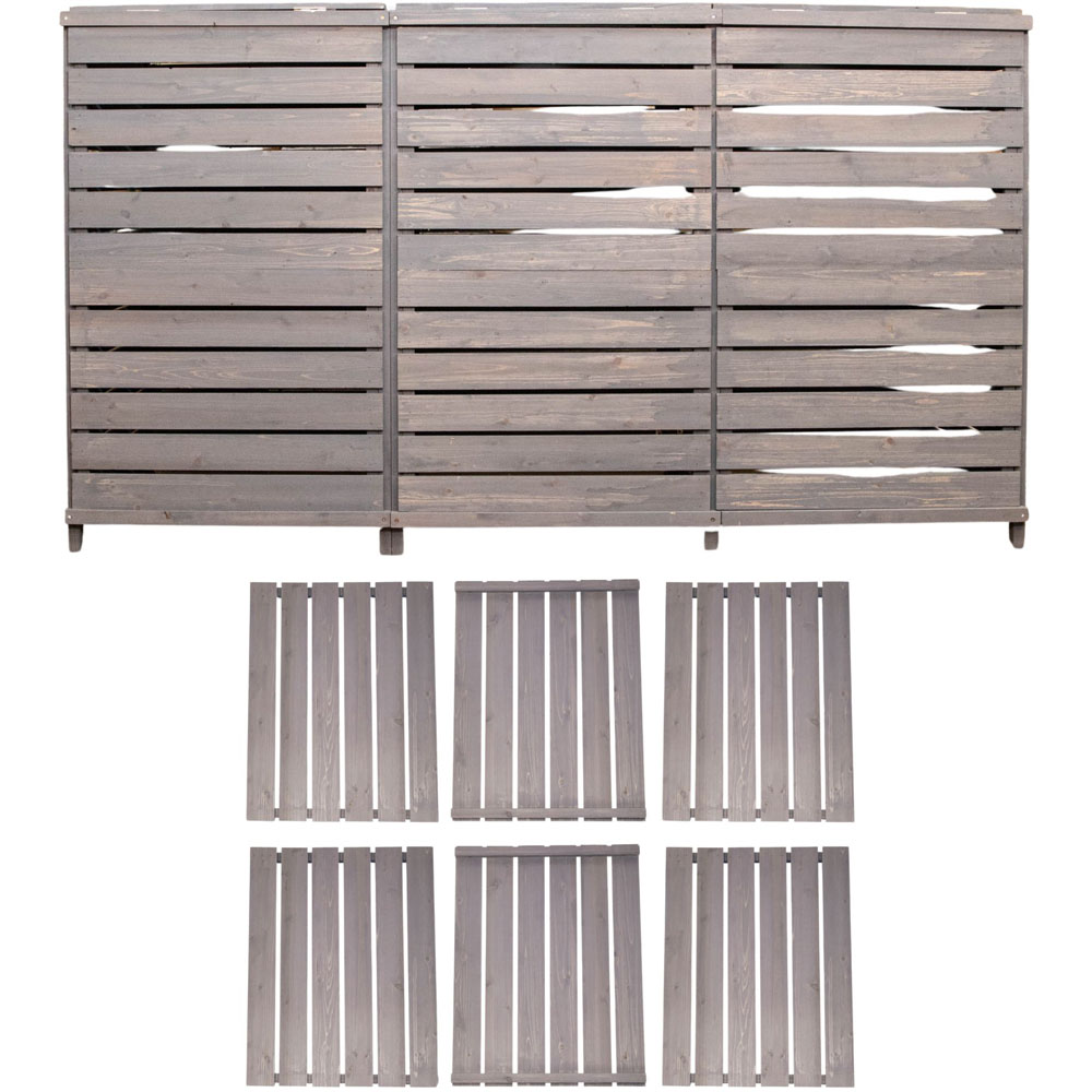 Relax and enjoy your outdoor leisure time in the garden this year without the unpleasant sight of your wheelie bins. This triple bin store is a set consisting of a double bin store unit and a separate single unit with back panels designed to neatly hide away and cover up to three standard-size wheelie bins with practical top-hinged lids and side-hinged front doors for easy access. The top hinged lids include a securing chain that can be attached to the bin lids allowing the lid of the bin to open when you lift the storage lid. The chain is attached by threading it through the handle of the bin lid and then attaching it to the store lid which can be easily removed when it's bin day. The grey-washed wooden frame is a contemporary and modern design that will compliment any garden and outdoor setting and the slatted design helps promote airflow and maintain a clean area. Supplied with a pack of back panels to hide the back of the bin store. The wood is ACQ-treated for durability and longevity. Supplied flat-packed and self-assembly is required. Please note: This is a single unit and a double unit to provide a triple storage unit and due to the hinge placement the units cannot be attached. External dimensions: 203cm wide, 114cm high. Load space is 63cm wide, 109cm high, 74cm front to back and takes up to a 240-litre bin.