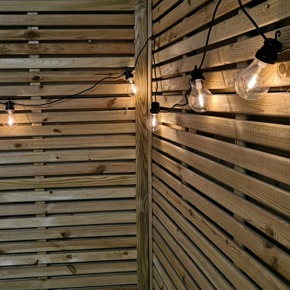 Transform your outdoor or indoor space into a cosy, inviting haven with this set of 10 connectable festoon bulb lights. Designed with both style and practicality in mind, these elegant warm white lights add a soft, ambient glow that’s perfect for any occasion, whether it’s a garden gathering, a special celebration, or a peaceful evening indoors. Featuring a lit length of 4.5 meters, each bulb is evenly spaced along a black cable, offering a charming, static glow that’s ideal for patios, weddings, garden parties, cafes, and events of all kinds. With their easy-to-use, connectable design, you can link up to 4 sets together (40 bulbs) to cover large areas without hassle. With a convenient built in timer function of 8 hours on and 16 hours off, the lights are mains powered and suitable for indoor and outdoor use and have a 5 meter power cable from the first bulb to the plug. The transformer must remain indoors. Product Specifications Lit Length: 4.5m Power Cable Length: 5m Spacing Between Each Bulb: 50cm Timer Function 8 hours on / 16 off Static Function Indoor and Outdoor Use (transformer must remain dry).