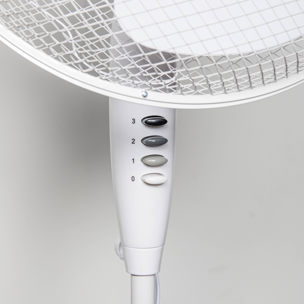 Relax and stay cool this year with this white standing fan. This fan is ideal for use anywhere around the home or at the office to keep cool during those summer months. Featuring three speed settings and easy-to-use controls with a wide-angle oscillating function, this fan provides plenty of control for your needs to get an instant breeze. With a sturdy base stand, the fan is ideal to be placed on most surfaces whether it's in the bedroom to cool down at night or at the office. The fan has three plastic blades with a metal mesh safety guard to prevent any possible injuries. With a 1.5m White power cable from product to plug there's plenty of wire allowing you to place this to suit your needs. Product Dimensions: Height: 119cm. Fan Diameter: 40cm. Stand Length: 63cm. Stand Thickness: 5cm.