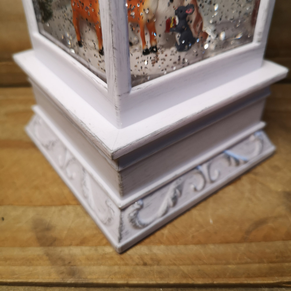 Brighten up your home this year with this Samuel Alexander White Lantern Spinner Snowman Scene LED Christmas Decoration 31cm. This charming decoration is suitable for anywhere around your indoor space making it perfect to be placed anywhere. Whether you choose to place it on the fireplace, in the window or on a tabletop. This White lantern features a snowman with woodland animals in a snowy scene. The water spinner is operated by 3 AA batteries (batteries not included). Simply add the batteries and watch the silver glitter spin around the snowy scene whilst it also lights up with Warm White LEDs. The decoration is sure to bring the festive spirit this Christmas and is the perfect choice for part of a display or a stand-alone piece. Suitable for indoor use only. Dimensions: H31cm.