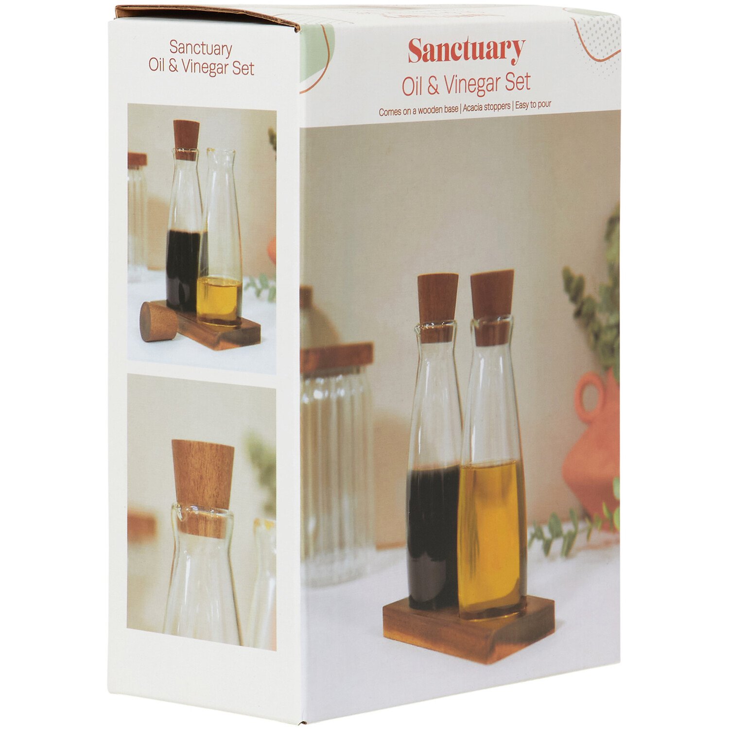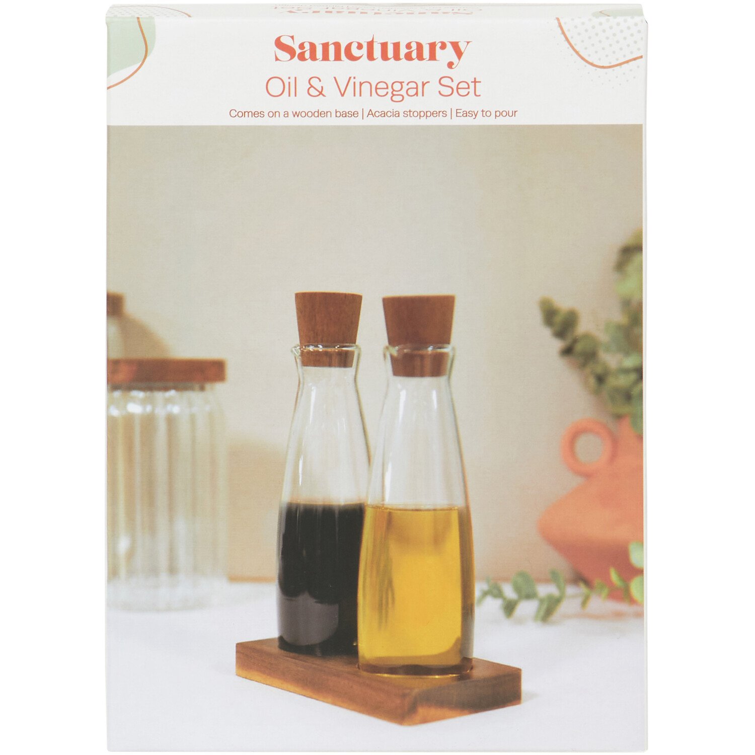 The Sanctuary Oil & Vinegar Set is a sleek and stylish way to store and display your oil and vinegar. Its modern design features elegant glass jars and a wooden base with stoppers, making it easy to coordinate with your kitchen and dining table. The bottles are easy to pour and will make any meal feel all the more special.