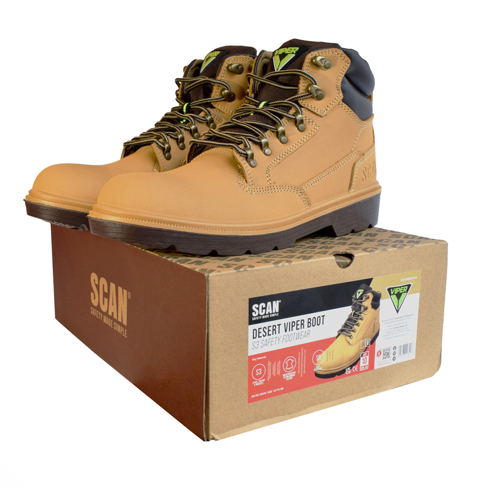 Let your feet breathe easily while staying secure in the Scan Desert Viper S3 Safety Boots Size 10. These boots are built for comfort and protection, making them perfect for tough work environments. The boots feature water-resistant action nubuck leather uppers, which help keep your feet dry. Inside, the padded mesh liner provides extra comfort, while the 200-joule steel toecaps and penetration-resistant steel midsoles protect your feet from impact and sharp objects. These boots are designed with an anti-static, fuel and oil-resistant and slip-resistant dual-density PU outsole. The reinforced cleated heel provides excellent traction, even on uneven ground. Plus, the heel includes a thermoplastic rubber guard and a pull tab for easy removal when you are done for the day. For additional comfort, the padded upper and cushioned tongue support your feet throughout the day.