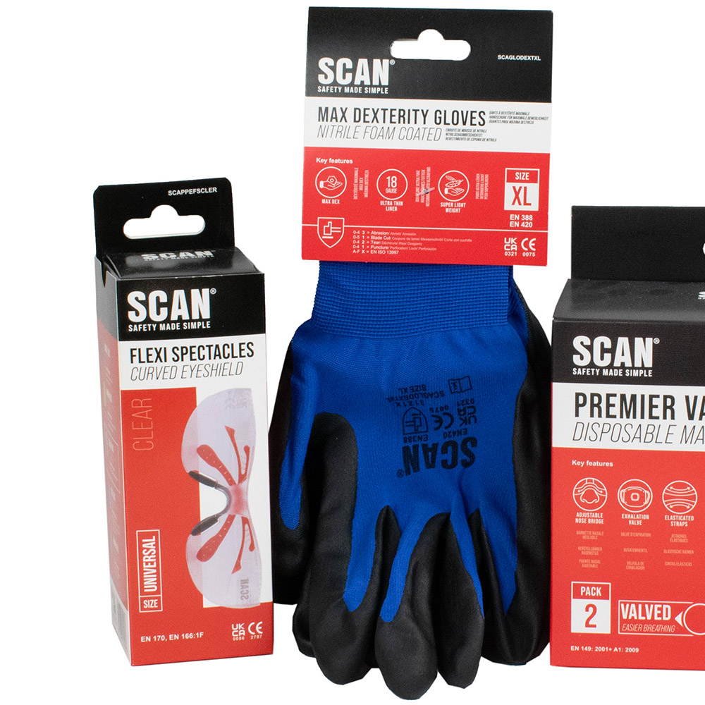 Ensure a safe working environment at your construction site with the Scan DIY Essentials Safety Kit. This kit is designed specifically for the DIY industry and is suitable for a variety of trades. It includes all the essentials needed for your daily tasks, offering maximum dexterity and feel, along with a full PVC face seal for a customized fit. The kit contains one pair of Scan Max Dexterity Nitrile Gloves, one pair clear Flexispecs and one pack of two P3 disposable masks.