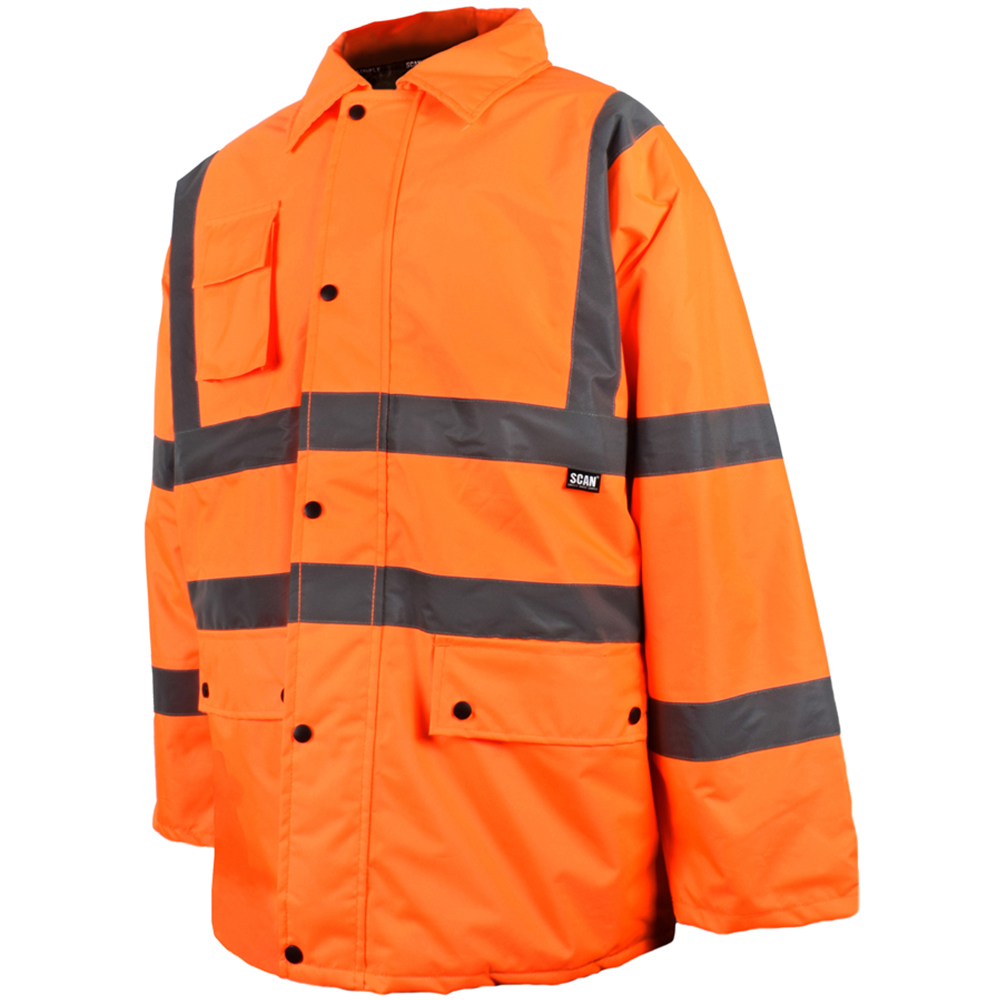 This Scan Hi Visibility Motorway Jacket XL in orange conforms to EN ISO 20471 Class 3 and EN343 Class (3.1.X) for protective clothing against foul weather. The shell is made of 100 percent polyester fabric 300D, featuring 190 polyester taffeta linings. It has stitched and taped seams. The jacket has a quilted liner and polyester wadding to ensure excellent insulation and warmth. With a heavy-duty zip, foldaway hood, studded storm flap, elasticated cuffs and hem, this jacket is excellent at protecting from foul weather conditions.