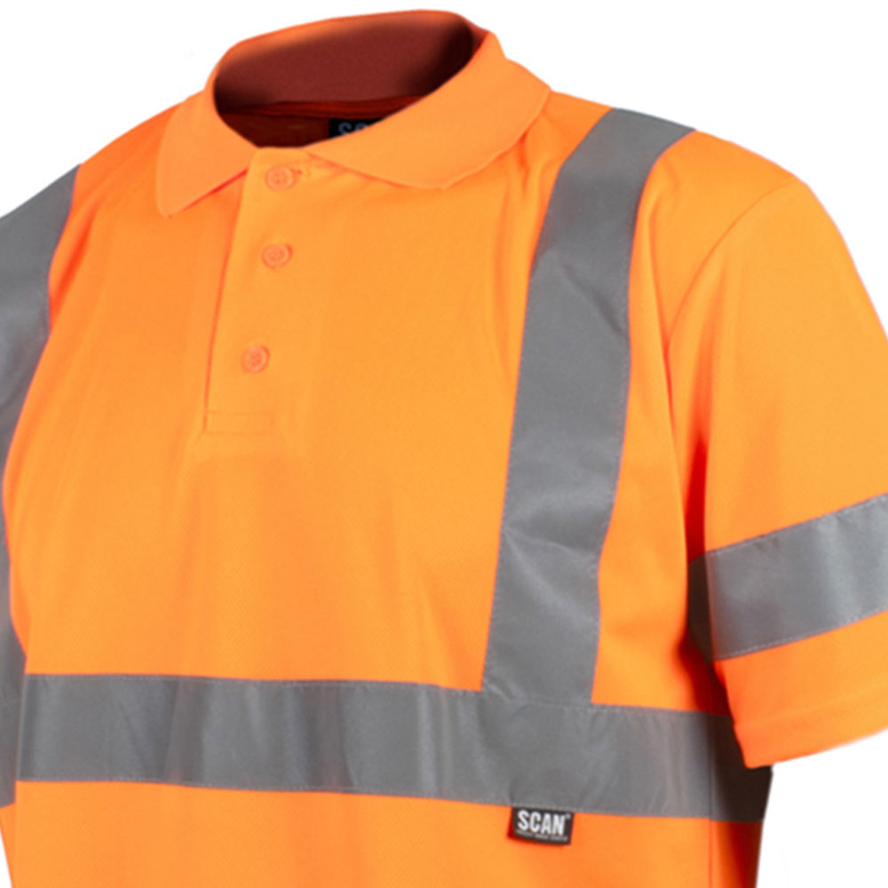 Scan Hi Visibility Polo Shirt XXL in orange conform to EN ISO 20471 Class 2. The polo shirt has horizontal and parallel panels that reflect light to maximise visibility, particularly during the hours of darkness. Hardwearing and comfortable to wear. The open collar and short sleeve make this shirt ideal for use in warm conditions or warehouse environments where visibility is required and protection from adverse weather conditions is not necessary.