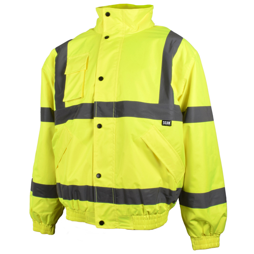 Stay visible and protected no matter the weather with the Scan High Visibility Bomber Jacket Large Yellow. Designed to meet EN ISO 20471 Class 3 and EN343 Class (3.1.X) standards, this waterproof bomber jacket offers top-notch protection against the elements. The 100% polyester 300D shell is durable, with a soft 190 polyester taffeta lining, polyester wadding and quilted nylon lining for extra insulation and warmth. With stitched and taped seams, a heavy-duty zip, and a foldaway hood, it keeps you shielded from rain and wind. Studded storm flap, elasticated cuffs and hem add additional protection, making this jacket a reliable choice for tough conditions.