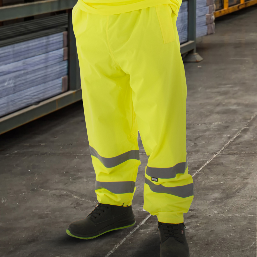 Get ready for the real workday hustle with the Scan High Visibility Motorway Trousers Large Yellow. These high-visibility trousers are perfect for staying safe in all weather conditions. They meet EN ISO 20471 Class 1 and EN343 Class (3.1.X) standards, offering protection against bad weather conditions. For optimal visibility, the trousers feature retro-reflective tape on the lower legs. Made from 100% 300D polyester with a polyurethane coating, they are built to keep you dry and comfortable. The waterproof seams are stitched and taped to prevent leaks, while the elasticated waistband ensures a snug, comfortable fit. The trousers come with ankle stud fasteners for added convenience.