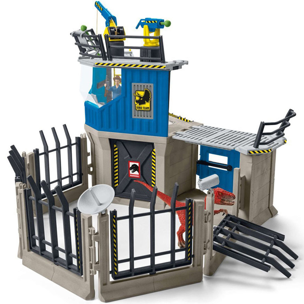 The Large dino research station from Schleich Dinosaurs offers plenty of adventure and playing fun! Deep in the Amazon jungle, the hidden station offers everything that's needed to research the last living dinosaurs. TEAM DINO, consisting of the 3 Colby brothers MAXX, LUIS and FLYNN, is on its way to uncovering the secrets! MAXX, the ringleader, has lots to do at the Large dino research station from Schleich Dinosaurs. In addition to the command centre, the station also has a viewing platform with swivelling tranquilizer dart gun and a crane. Underneath there is a quarantine room for newly captured dinos. The first examinations can be made here right away, and then the dinosaurs can be released into the enclosure through the trapdoor. Oh no! The velociraptor escaped! Can MAXX catch it again with his pole-arm? The playset contains lots of accessories and 2 cool painted dinos.