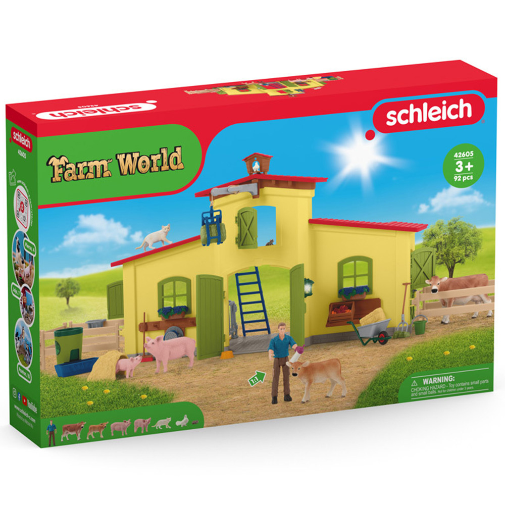 There's never a dull moment in Farmer Paul's barn. How could there be? Cows, pigs, cats and doves all want to be cared for. He uses the winch to fetch hay to feed the animals from the hayloft. To speed up the feeding process, he sets the feed carousel in motion. Only the calf gets to be fed by hand with a bottle. After the work is done, he treats himself to a juicy apple. Farmer Paul always has his hands full. The pigs are grunting loudly and want to be fed, and the cow in the barn is already looking pretty hungry. But before Farmer Paul feeds her some hay, the little calf gets its milk from the bottle. All the animals come into the barn to eat. Especially the pigs, hoping for a juicy apple or a crunchy carrot. Once they have eaten their fill, they go back outside. Farmer Paul has put up fences around the farm so that everyone can get some fresh air. But the fences don't stop the cat from climbing onto the roof or the doves from flying all over the place. They always come back, though, because Farmer Paul takes such great care of them, too. He has even built the doves their own house, called a dovecote, where they like to hide from the cat when it comes slinking around. Pretty nifty! There's room for even more animals in the matching pony box, which is available separately. Discover the world through play with the authentic and detailed figures by Schleich. They look so real they may just start moving. Schleich products fire the imagination and guarantee an educational play experience full of adventure. This Schleich product belongs to the FARM WORLD theme world and is suitable for children between 3 and 8 years.