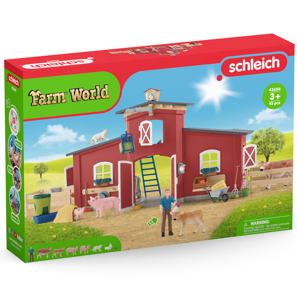 On Farmer Paul's big farm, everyone lives under one roof. Paul has his bedroom behind the pretty mullioned windows with flower boxes in front of it, and the animals sleep in the cozy barn. During the day they come to the sunny pasture, only to eat all like to gather in the yard. Then Paul sets the feed carousel in motion and fetches fresh hay from the hayloft with the winch. When Farmer Paul looks out of the window of his big red farmhouse in the mornings, his animals are already wide awake. So even before he gets to eat his own breakfast, he makes sure to feed the cow, calf, pig and piglet. The cat also gets a saucer of milk, although it was supposed to catch the curious mouse in the hayloft. Once all the animals are fed, Farmer Paul uses the winch to move the hay to the hayloft. He drives the animals out to pasture so that he can clean the stalls properly. The dove watches him from its little house on the roof and sometimes coos, ''You've missed a bit!''. Discover the world through play with the authentic and detailed figures by Schleich. They look so real they may just start moving. Schleich products fire the imagination and guarantee an educational play experience full of adventure. This Schleich product belongs to the FARM WORLD theme world and is suitable for children between 3 and 8 years.