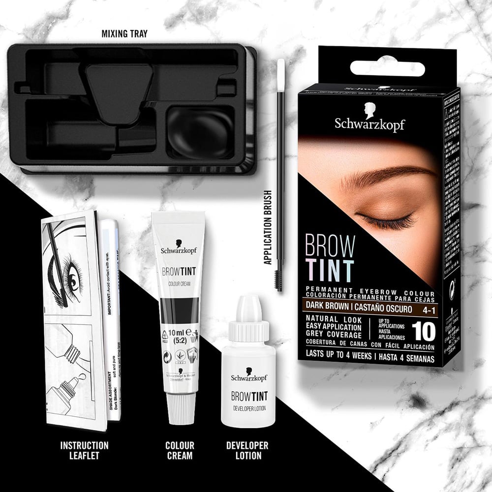 Schwarzkopf Brow Tint Professional Permanent Eyebrow Dye Tinting Kit, Dark Brown 3pk Schwarzkopf Brow Tint Dark Brown Permanent Eyebrow Colour, Intensify and define your eyebrows with professionally inspired and permanent brow colouration. Brow tint - Intensify and define your eyebrows with professionally inspired and permanent brow colouration so you can achieve statement brows to be proud of How it works - Mix the colour cream and developer lotion into the bowl and apply on clean eyebrows using the application brush. Leave for 5-10 mins then remove residue with warm water and a cotton pad Long-lasting - The developer gel has the ability to penetrate the hair shaft, meaning your newly coloured brows will remain to look fabulous for up to four weeks Grey coverage - This kit contains approximately 10 applications. That's your brow maintenance sorted for almost a year, and it also gives complete grey coverage The Range Schwarzkopf's Brow Tint is available in four shades: Dark Blonde, Light Brown, Dark Brown and Black. You can choose the perfect colour to complement your hair colour Features: Permanent eyebrow colour that accentuates your eyebrows Natural-looking and long-lasting result Grey coverage Professional quality formula Easy and precise application with application brush Short application time for quick results Lasts up to 4 weeks Up to 10 applications Ingredients: Aqua, Cetyl Alcohol, Stearyl Alcohol, Glyceryl Stearate, Toluene-2,5-Diamine Sulfate, Ammonium Hydroxide, 6-Methoxy-2-Methylamino-3-Aminopyridine HCl, Potassium Stearate, Resorcinol, Sodium Sulfite, m-Aminophenol, 2,4-Diaminophenoxyethanol HCl, Tetrasodium EDTA, Acrylates Copolymer, 4-Amino-2-Hydroxytoluene, Citronellol, Phenethyl Alcohol, Potassium Hydroxide, CI 77891, Aqua, Hydrogen Peroxide, Cetearyl Alcohol, PEG-40 Castor Oil, Etidronic Acid, Sodium Cetearyl Sulfate, Disodium Pyrophosphate, 2,6-Dicarboxypyridine, Potassium Hydroxide, Sodium Benzoate. Box Contains: Brow Tint Eye Brow Dye, Dark Brown 3pk