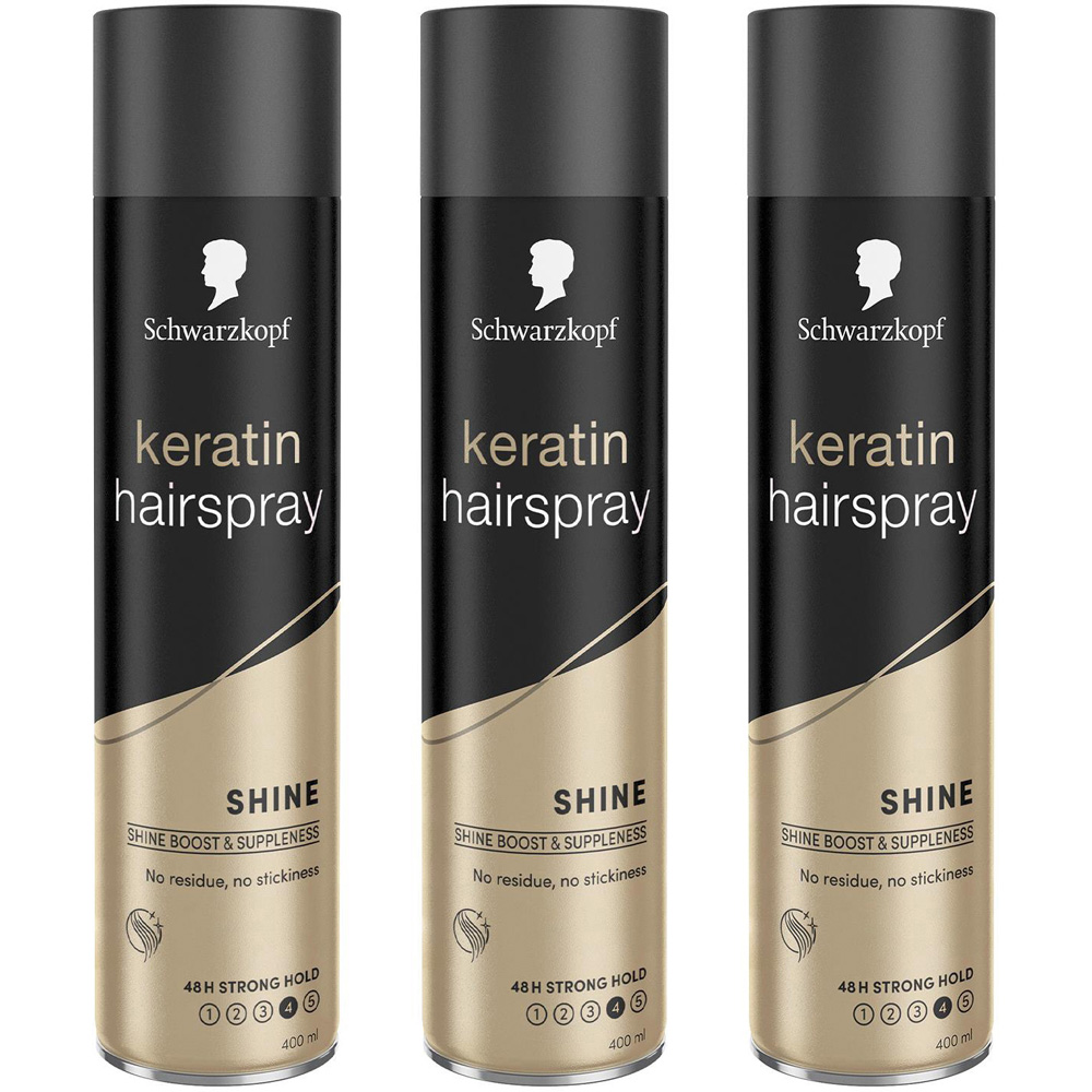 3pk of 400ml Schwarzkopf Keratin 48H Extra Strong Hold Supple Hair Spray Schwarzkopf Keratin Hairspray with strong hold level 4 for 48 hour hold. For added shine and supple hair, the hairspray strengthens hair and provides natural movement. Features: 48 hour maximum style-control with extra strong hold. Strengthens the hair & provides natural movement. No stickiness, no residue, easy to brush out. Helps to protect the hair from humidity & UV radiation. How to Use: Apply on dry hair. Use in short bursts. If valve should clog, please rinse with warm water. For finishing: keep 30 cm distance when spraying. For styling of single strands: spray hair from roots to tips and bring into shape. For an optimal styling-result also use Schwarzkopf Keratin Heat Spray. Safety Warning: Danger. Extremely flammable aerosol. Pressurised container: May burst if heated. Keep away from heat, hot surfaces, sparks, open flames and other ignition sources. No smoking. Do not spray on an open flame or other ignition sources. Do not pierce or burn, even after use. Protect from sunlight. Do not expose to temperatures exceeding 50 C. Keep out of reach of children. Read the label before use. Use in well-ventilated places. Do not spray into the eyes. Package Contains: 3pk of Schwarzkopf Keratin 48H Strong Hold Hair Spray 400ml