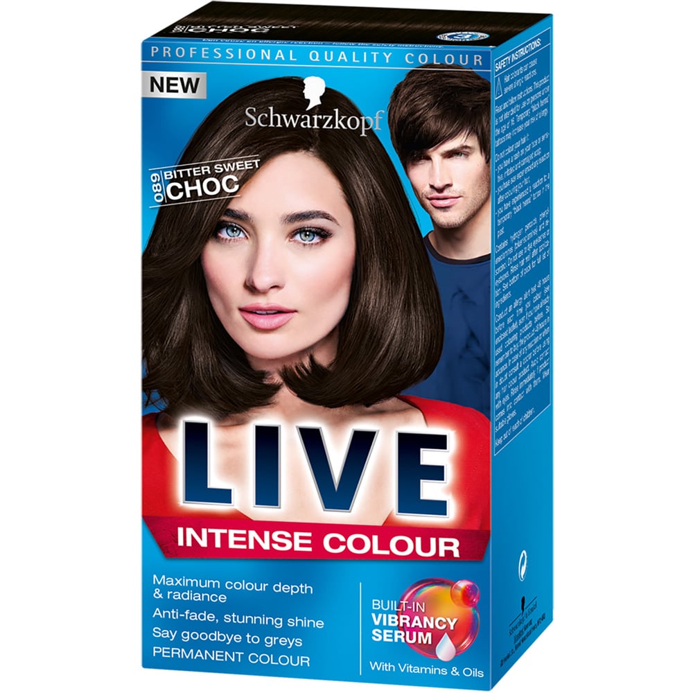 Get vibrant professional-grade colour with this Schwarzkopf Live Intense 035 Bitter Sweet Chocolate Permanent Hair Dye 142g. Specially developed for dark hair, its vibrant colour is fade-resistant and full of impressive shine. It features a built-in vibrancy serum, with vitamins and oils, that activates the colour pigments at the core of each strand to maximise colour depth and radiance. Its innovative formula lightens your hair up to three levels without a brassy effect for striking colour intensity, anti-fade and stunning shine. Shade: 035 Real Red. Size: 142g.
