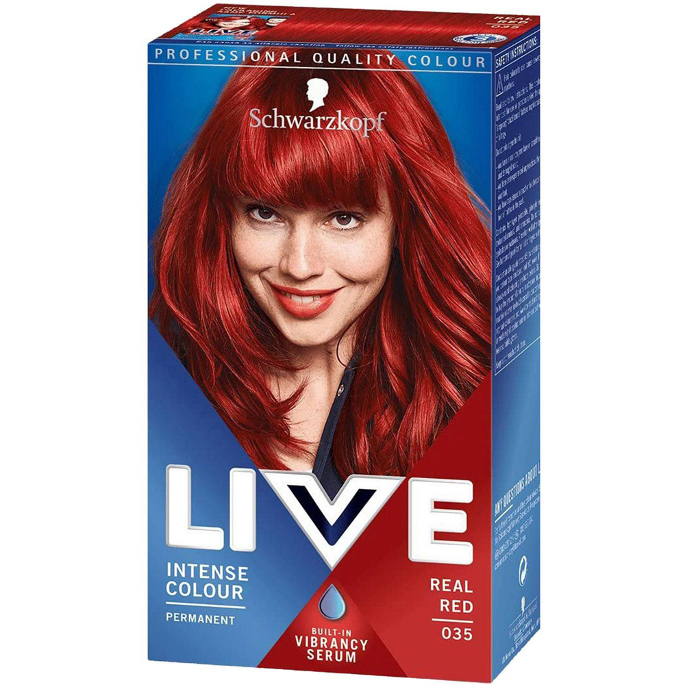 Schwarzkopf Live Intense Semi-permanent or Permanent hair colour in real red offers extra long-lasting, intense colour and amazing shine, so you can show off your inner confidence with ease. The Live Intense Colour range gives you maximum colour depth and radiance. With built-in Vibrancy Serum for anti-fade and stunning shine - say goodbye to greys. Features: Extra intense, Long-lasting, vibrant colour Built-in vibrancy serum Maximum colour depth and radiance Comes with vitamins & oils Anti-fade, stunning shine Ingredients: Colour Cream: Aqua, Cetearyl Alcohol, Ammonium Hydroxide, Coconut Alcohol, Cocamidopropyl Betaine, Ceteareth-50, Cocos Nucifera Oil, Ceteareth-20, Parfum, Sulfuric Acid, Potassium Hydroxide, Sodium Chloride, Sodium Sulfite, Ascorbic Acid, Sodium Silicate, Propylene Glycol, Etidronic Acid, Toluene-2, 5-Diamine Sulfate, Resorcinol, N, N-Bis(2-Hydroxyethyl)-p-Phenylenediamine Sulfate, 2-Amino-4-Hydroxyethylaminoanisole Sulfate, 2-Methylresorcinol, 4-Amino-2-Hydroxytoluene, Quartz Care Conditioner: Aqua, Cetearyl Alcohol, Behentrimonium Chloride, Prunus Armeniaca Kernel Oil, Litchi Chinensis Fruit Extract, Morinda Citrifolia Fruit Extract, Panthenol, Hydrolyzed Keratin, Isopropyl Myristate, Citric Acid, Phenoxyethanol, Stearamidopropyl Dimethylamine, Isopropyl Alcohol, Glyceryl Stearate, Parfum, Sodium Methylparaben, Propylene Glycol, Polyquaternium-37, Glycerin, Dicaprylyl Carbonate, Butylphenyl Methylpropional, Limonene, Linalool, Hexyl Cinnamal, Lauryl Glucoside, Potassium Sorbate Hoe to Use: Express Your Colour Creativity Discover intense colour vibrancy thanks to the built-in electrifying pigments. Schwarzkopf Selection Guide 1 Washout in 12-15 washes 2 Lasts up to 28 washes 3 Permanent For long or thick hair we recommend using two packs. Note: Conduct an allergy alert test 48 hours before each time you colour. Box Contains: 1 x Tube of LIVE Colour Crème, 50ml 2x Sachets LIVE Colour Conditioner, 15ml 1 x Pair of Gloves, 1 x Instruction Leaflet