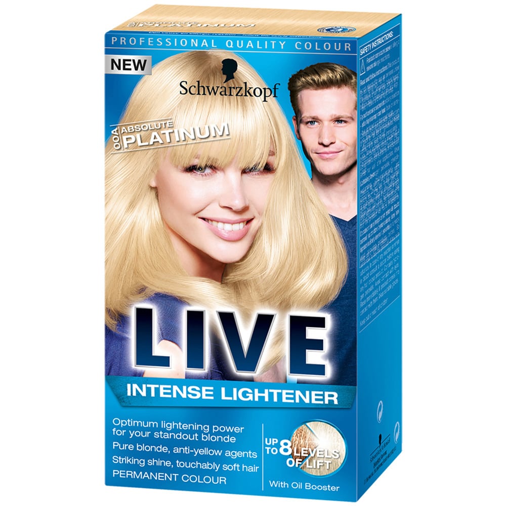 Go brighter and bolder with Schwarzkopf Live Intense Lightener 00A Absolute Platinum Permanent Hair Dye. This professional-quality dye neutralises brassy tones with anti-yellow agents for a pure, luminous blonde. The oil-infused after-treatment leaves hair touchably soft, while the formula delivers striking shine and long-lasting colour that looks salon-fresh.