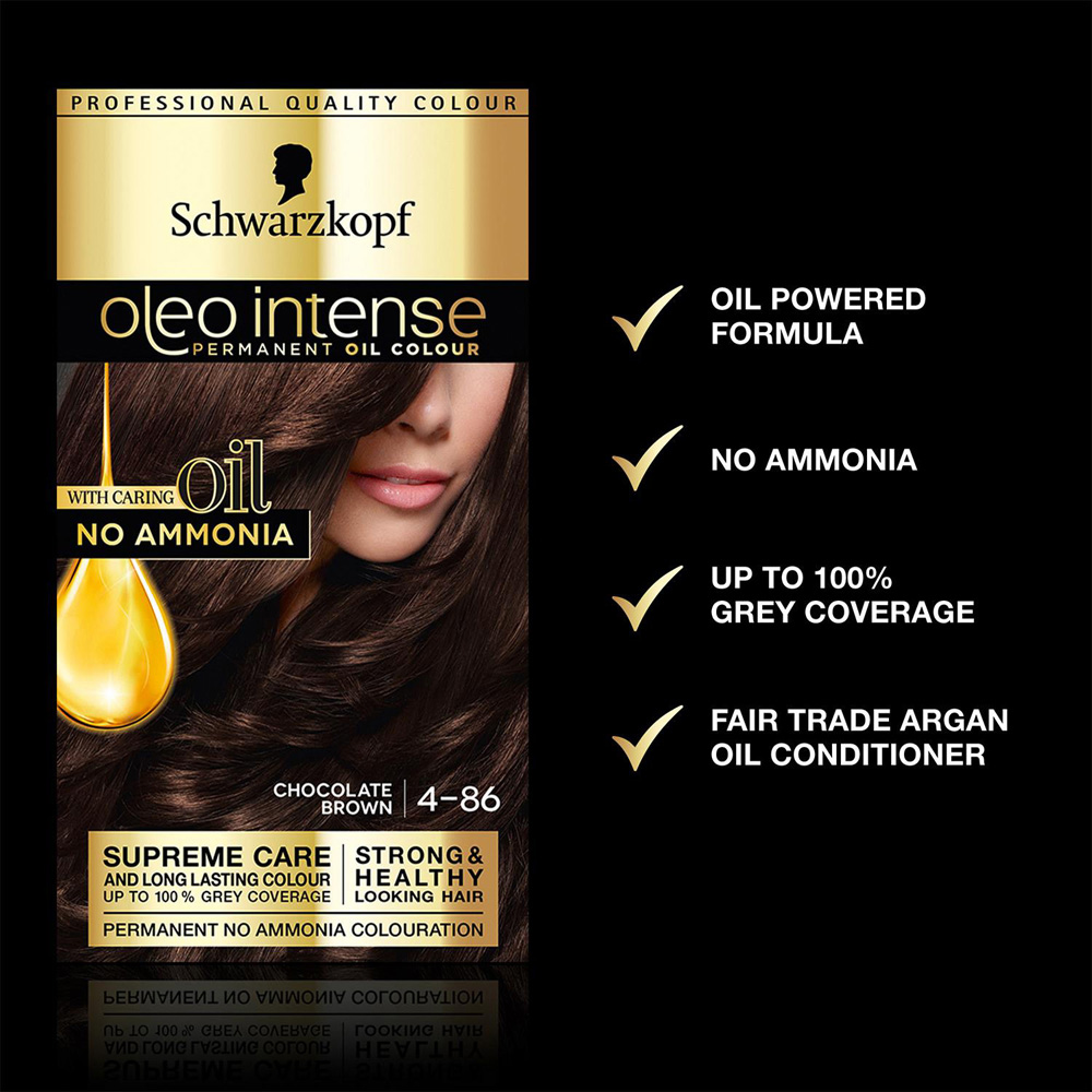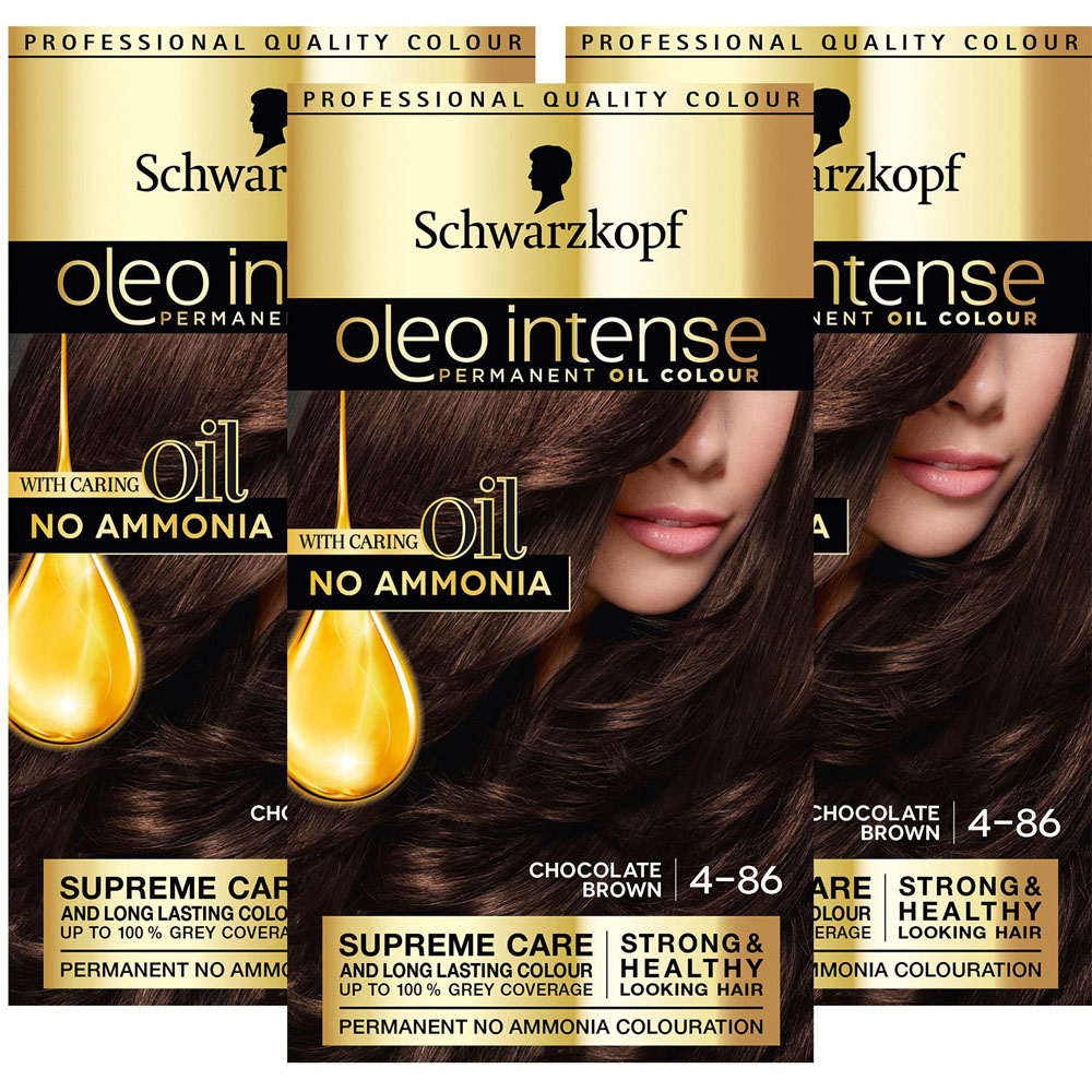 3 pack Schwarzkopf Oleo Intense 4-86 Chocolate Brown No Ammonia Permanent Oil Colour. For 120 years Schwarzkopf has been a pioneer of hair, combining quality ingredients and the latest haircare technology to ensure maximum performance. Schwarzkopf's dedication to creating expertly crafted and hard-working products has been their top priority from day one. Introducing Schwarzkopf Oleo Intense, a permanent hair colour infused with oils for supreme care. With Fair Trade argan oil, Oleo Intense leaves hair soft and full of shine.