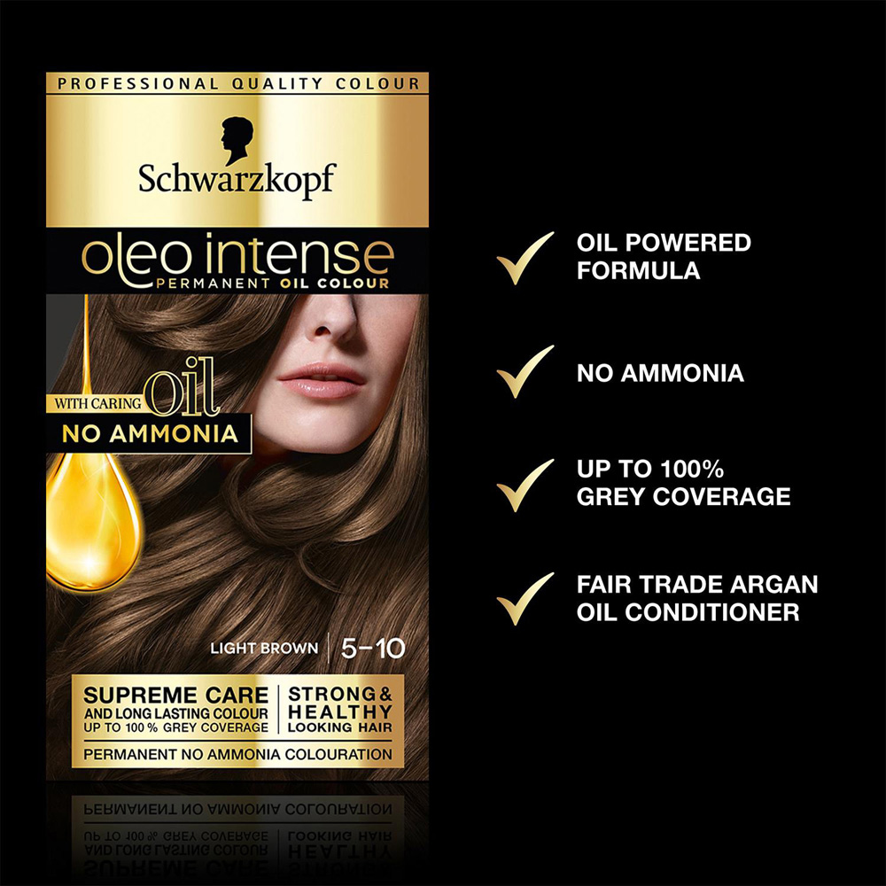 3 pack Schwarzkopf Oleo Intense 5-10 Light Brown No Ammonia Permanent Oil Colour. For 120 years Schwarzkopf has been a pioneer of hair, combining quality ingredients and the latest haircare technology to ensure maximum performance. Schwarzkopf's dedication to creating expertly crafted and hard-working products has been their top priority from day one. Introducing Schwarzkopf Oleo Intense, a permanent hair colour infused with oils for supreme care. With Fair Trade argan oil, Oleo Intense leaves hair soft and full of shine.