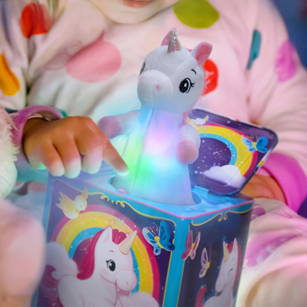 Bring your child's unicorn dreams to life with this Schylling Unicorn Jack in the Box. Bright and shiny, the toy features an array of rainbow colours that glow from its belly and has a lovely 'twinkle twinkle little star' tune. A special music box, it's perfect for a bedroom or nursery decor or sitting proudly on top of the toy box. Apart from this, it makes the bedroom even more magical for little dreamers and unicorn lovers. Made from tin, this delightful toy has an attractive design and lights up in five different colours. The sturdy construction ensures lots of years of playtime and longer shelf life. Ideal for children over eighteen months.