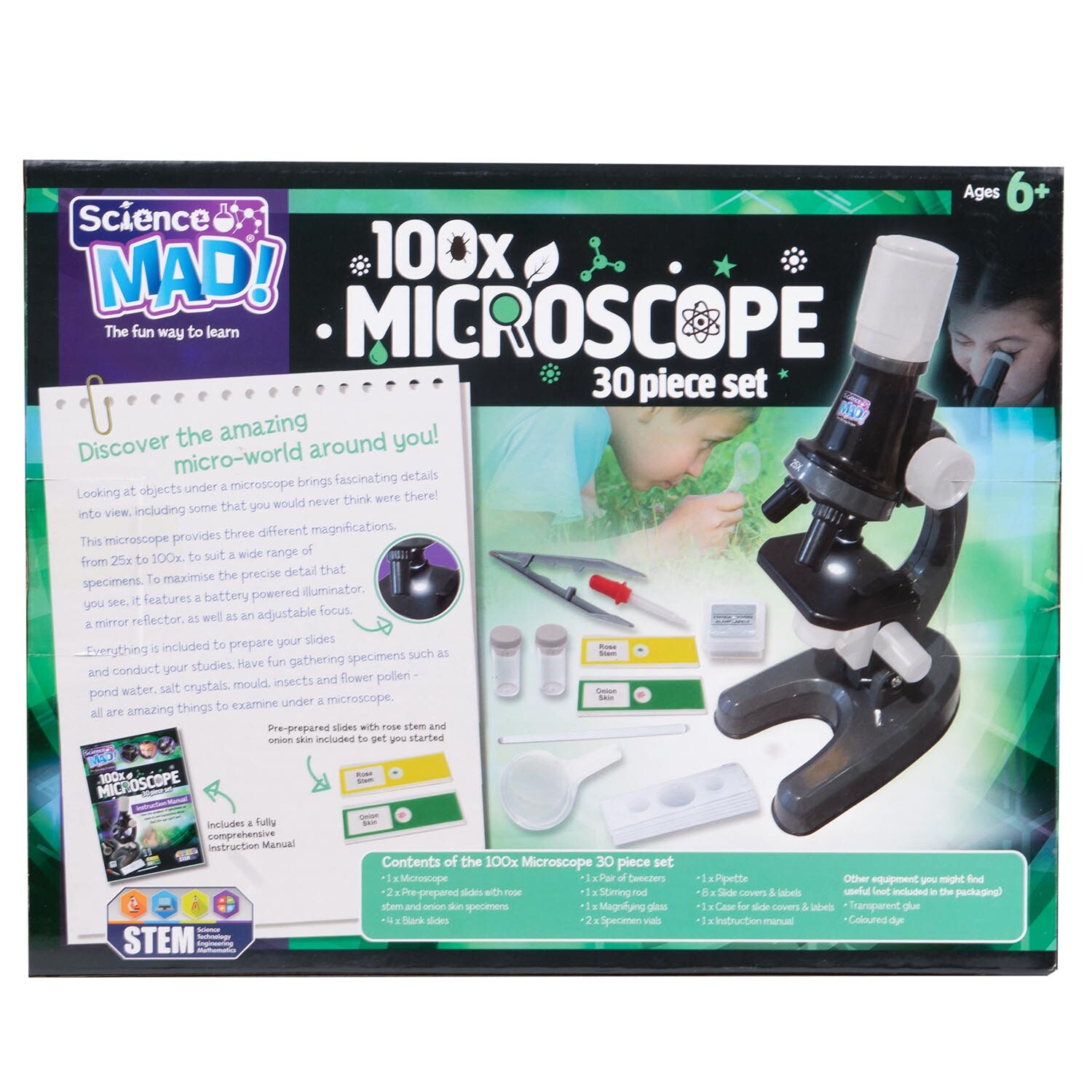 View the smallest of specimens up close to see fascinating detail that the eye can't see with the Science Mad 100x Microscope. Featuring bright battery-powered illumination, up to 100X magnification and everything you need to prepare your own slides, this set allows children to develop their interest in STEM subjects with ease, making it a fun way to learn.