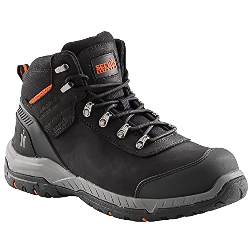 High-spec S3 antistatic mid-ankle safety boot. Composite toe and midplate for lightweight, flexible protection from sole penetration. Nubuck leather, water-resistant upper. Underfoot shock absorption and a Poron sock for extra cushioning. Durable moulded toe protects against scuffs.