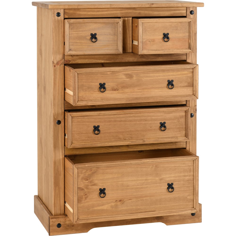 The Seconique Corona Storage Chest offers an abundance of storage space with two smaller drawers atop three larger ones. This chest provides versatility in organizing various items, whether clothing, accessories, or household essentials. Made using solid pine wood, its distressed waxed pine finish adds a rustic charm, making it a practical and stylish addition to your bedroom or living area, ensuring your belongings are neatly stored.