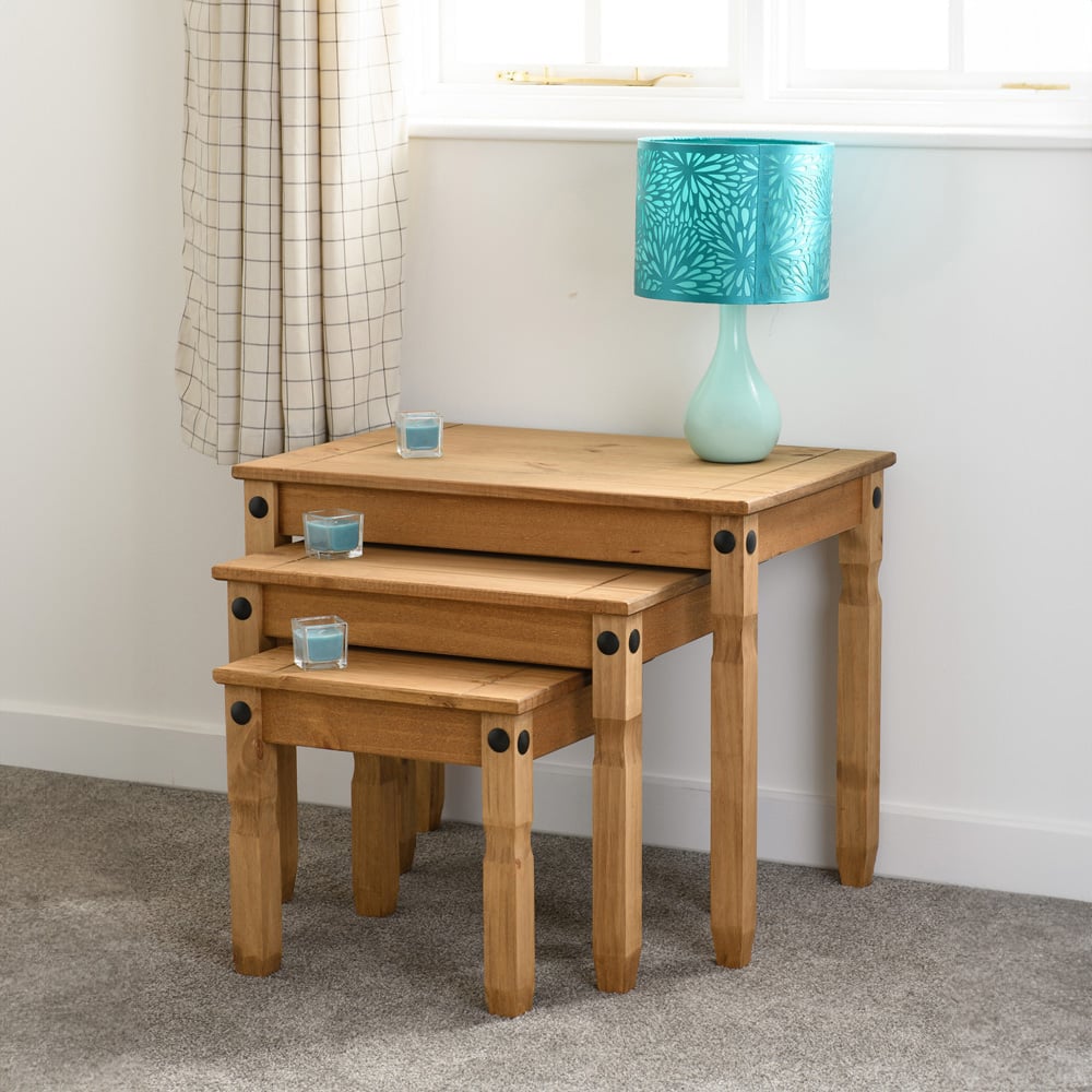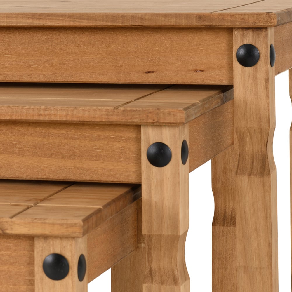Add functionality and style to your space with this Seconique Corona Distressed Waxed Pine Nest of Tables Set of 3. Crafted from durable distressed waxed pine, this set of nested tables exudes rustic charm, adding character to your room. Also, with a versatile design, they provide additional surface space when needed and neatly stack together when not in use, making them a practical and visually appealing addition to your home. Set of 3.