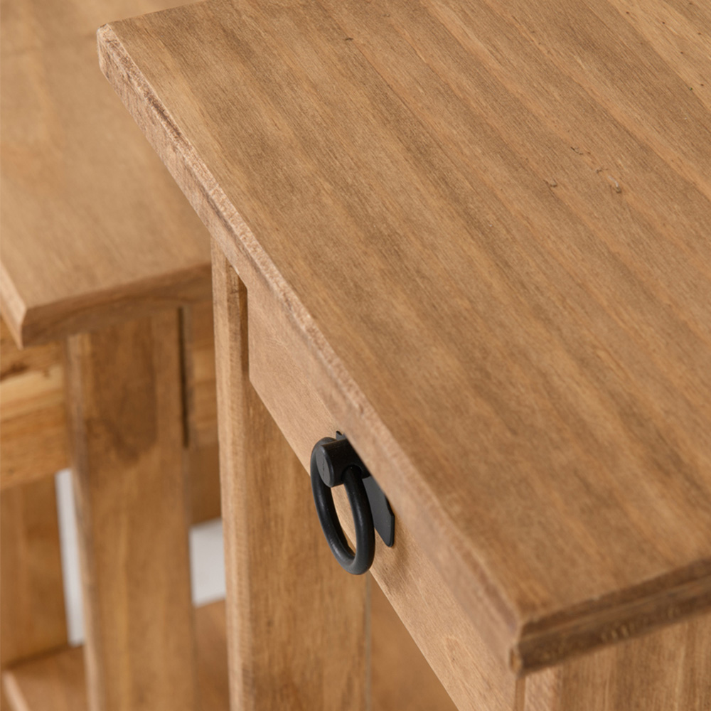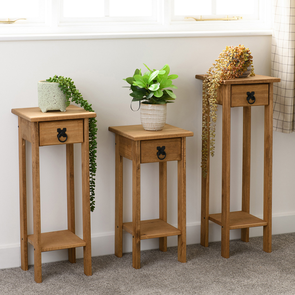 Simple yet stylish, this set of three Seconique Corona Plant Stands will make a versatile addition to any space. Crafted from durable distressed waxed pine wood, these stands elegantly merge display with functional storage. With a rustic charm and practical design, they offer elevated platforms for showcasing while providing a convenient drawer for organizing small items. These stands effortlessly combine utility and style, enhancing your home decor with their character and warmth.