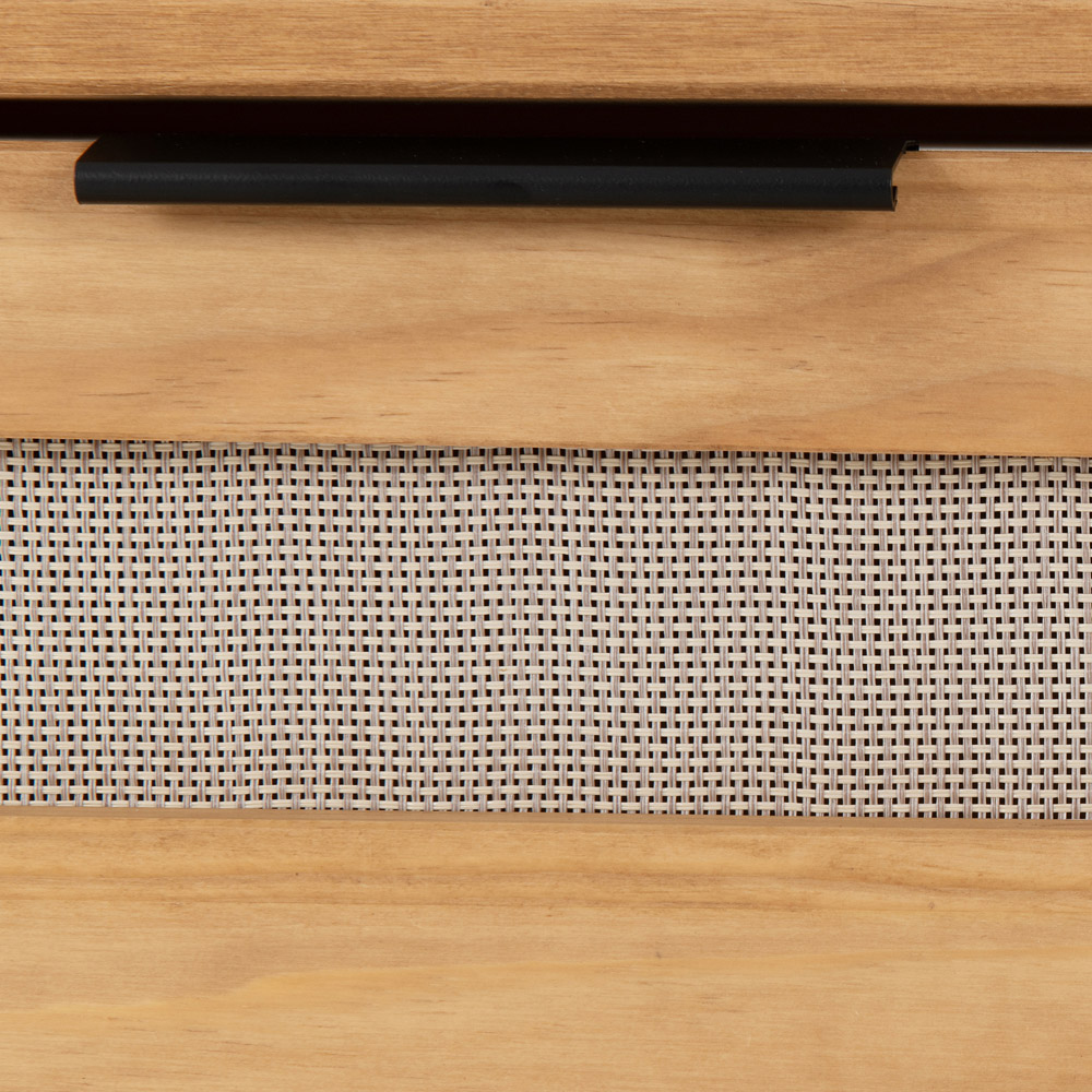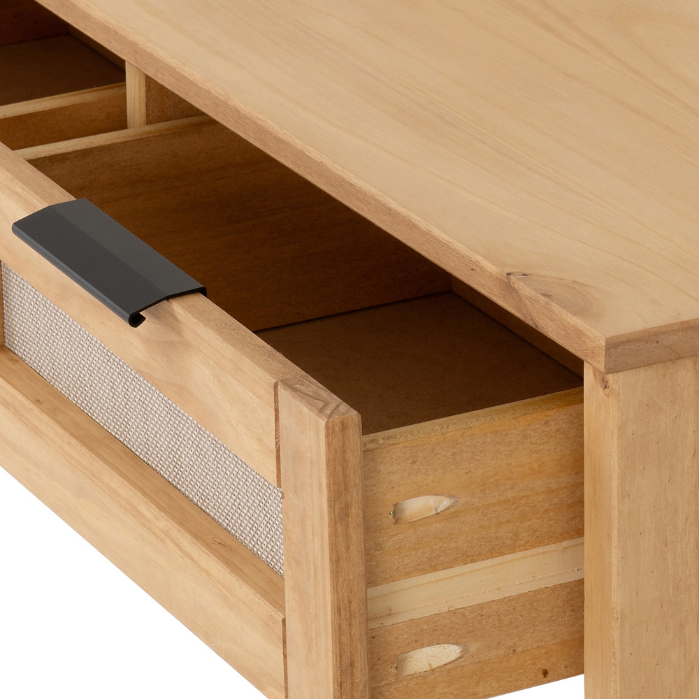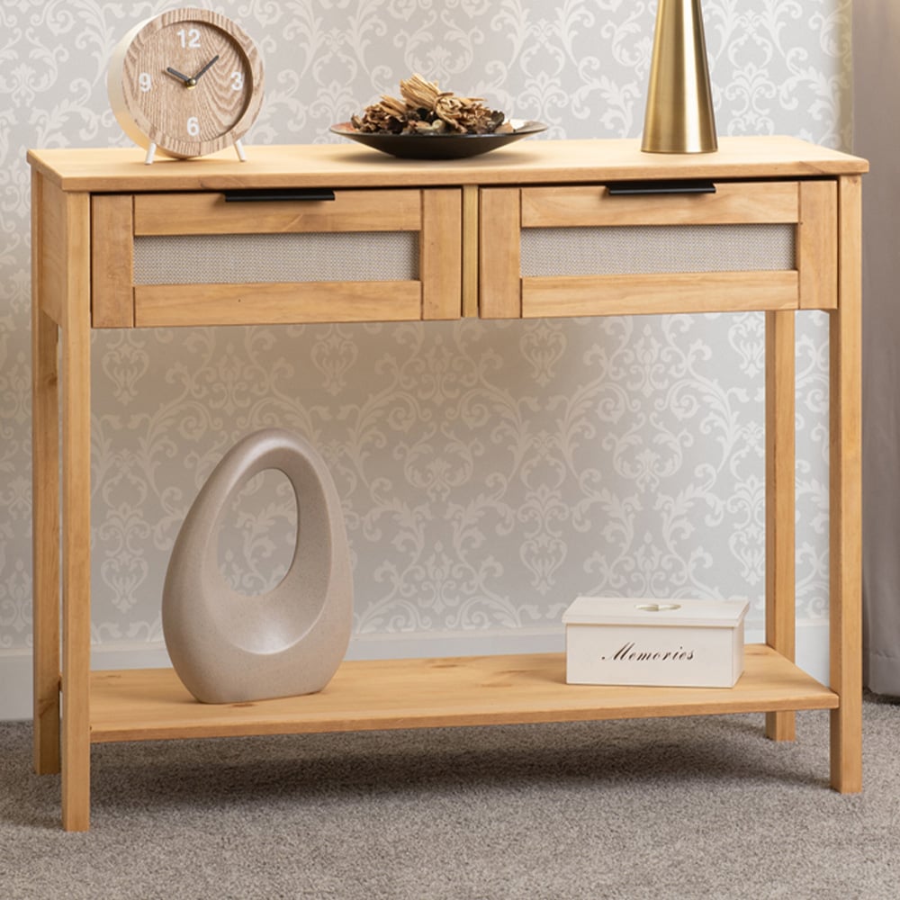Upgrade your home decor with the Corona Rattan 2 Drawer Console Table, a perfect blend of rustic charm and modern functionality. Crafted from solid pine with a distressed waxed finish, this console table exudes a timeless appeal. The rattan-style drawers, coupled with black metal hardware, add a touch of elegance, while the shelf underneath provides additional storage space. The ample storage capacity makes it ideal for keeping your essentials organized and within easy reach.
