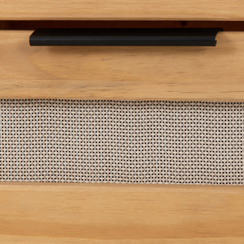 - Made from pine, rattan, MDF drawer base, and metal handle