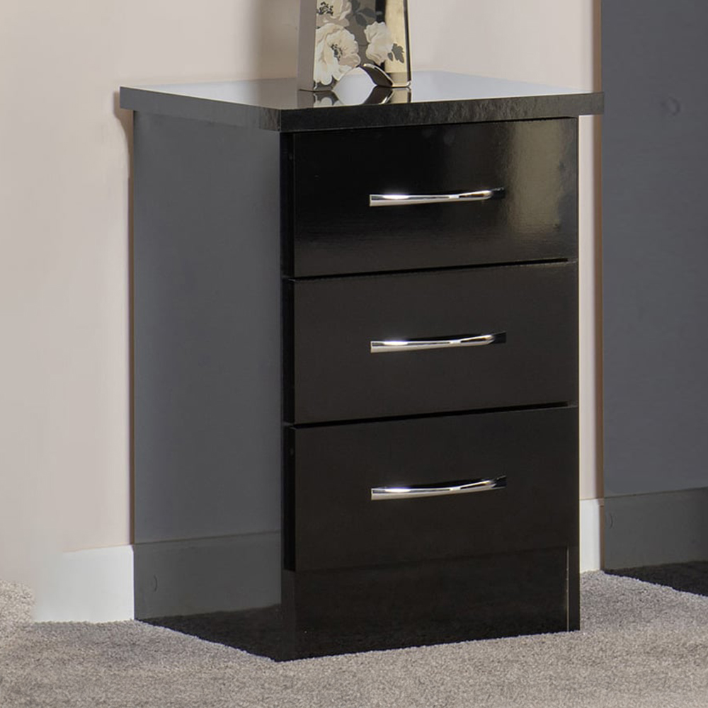 Keep your essentials at hand's reach with this Seconique Nevada 3 Drawer Black Gloss Bedside Table, a charming and functional addition to your bedroom. The bedside table features three drawers that provide convenient storage for essentials like books, glasses, or personal items. The compact size of the bedside table makes it ideal for smaller spaces, while the three drawers with metal handles offer practical organisation. Enhance the rustic charm of your bedroom with this bedside, combining style and functionality in a compact and appealing design.