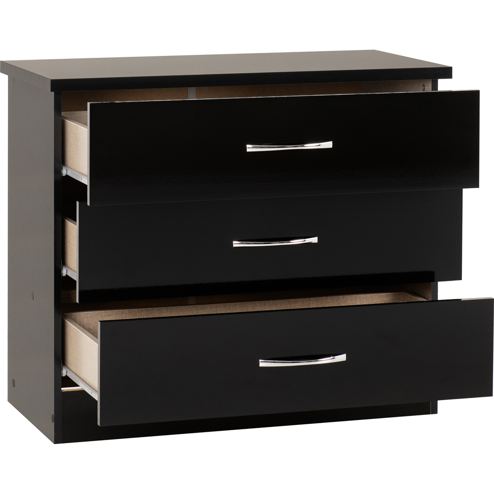 Organise your belongings with elegance and ease with this Seconique Nevada 3 Drawer Black Gloss Chest, a stylish and functional furniture piece for your living space. Featuring a modern design, the chest boasts three spacious drawers with metal handles for convenient storage. Its compact size makes it suitable for bedrooms, living rooms, or any area in need of practical storage. The chest effortlessly combines form and function, offering a chic and efficient way to keep your belongings organised while elevating the aesthetic of your home.