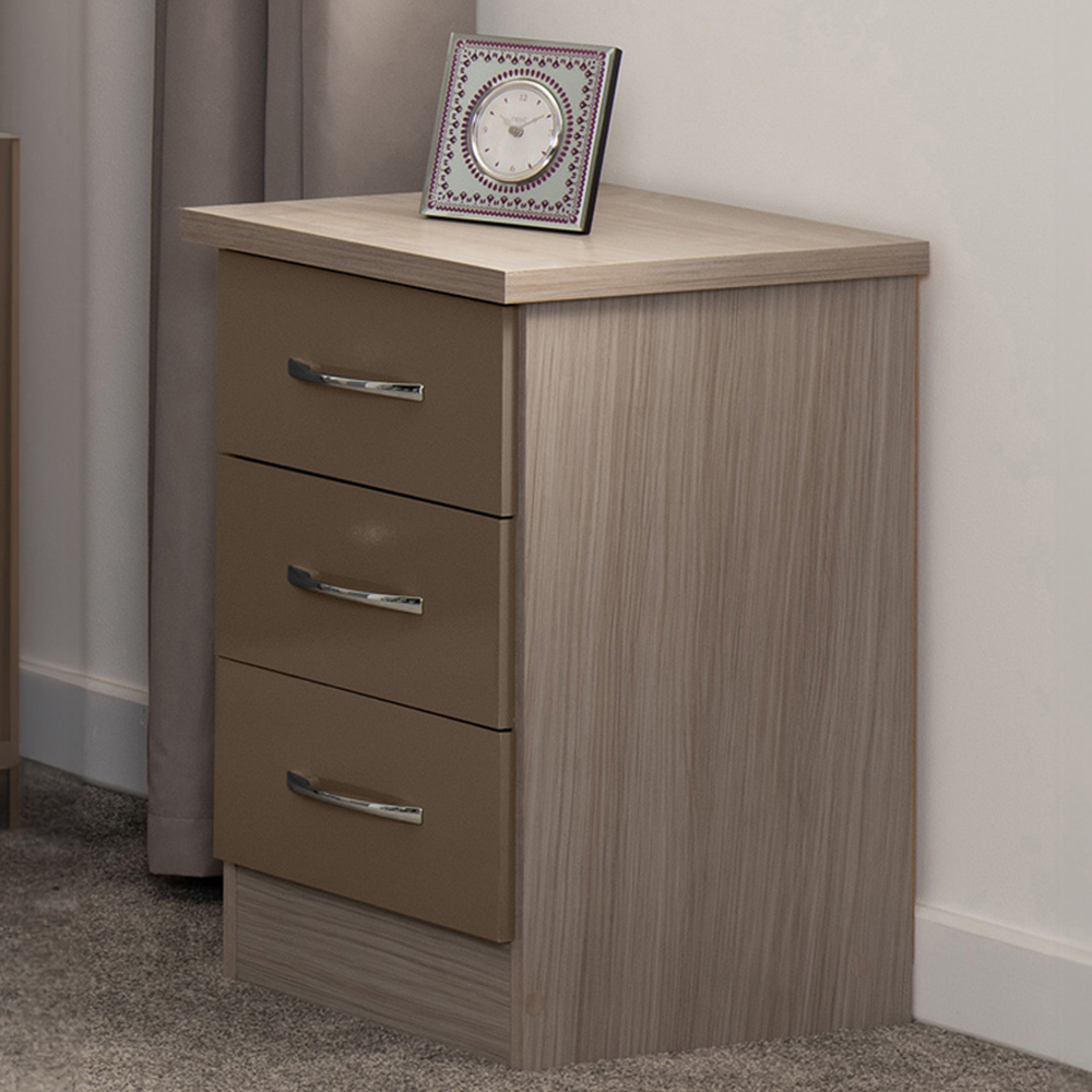 Keep your essentials at hand's reach with this Seconique Nevada 3 Drawer Oyster Gloss and Light Oak Effect Veneer Bedside Table, a charming and functional addition to your bedroom. The bedside table features three drawers that provide convenient storage for essentials like books, glasses, or personal items. The compact size of the bedside table makes it ideal for smaller spaces, while the three drawers with metal handles offer practical organisation. Enhance the rustic charm of your bedroom with this bedside, combining style and functionality in a compact and appealing design.