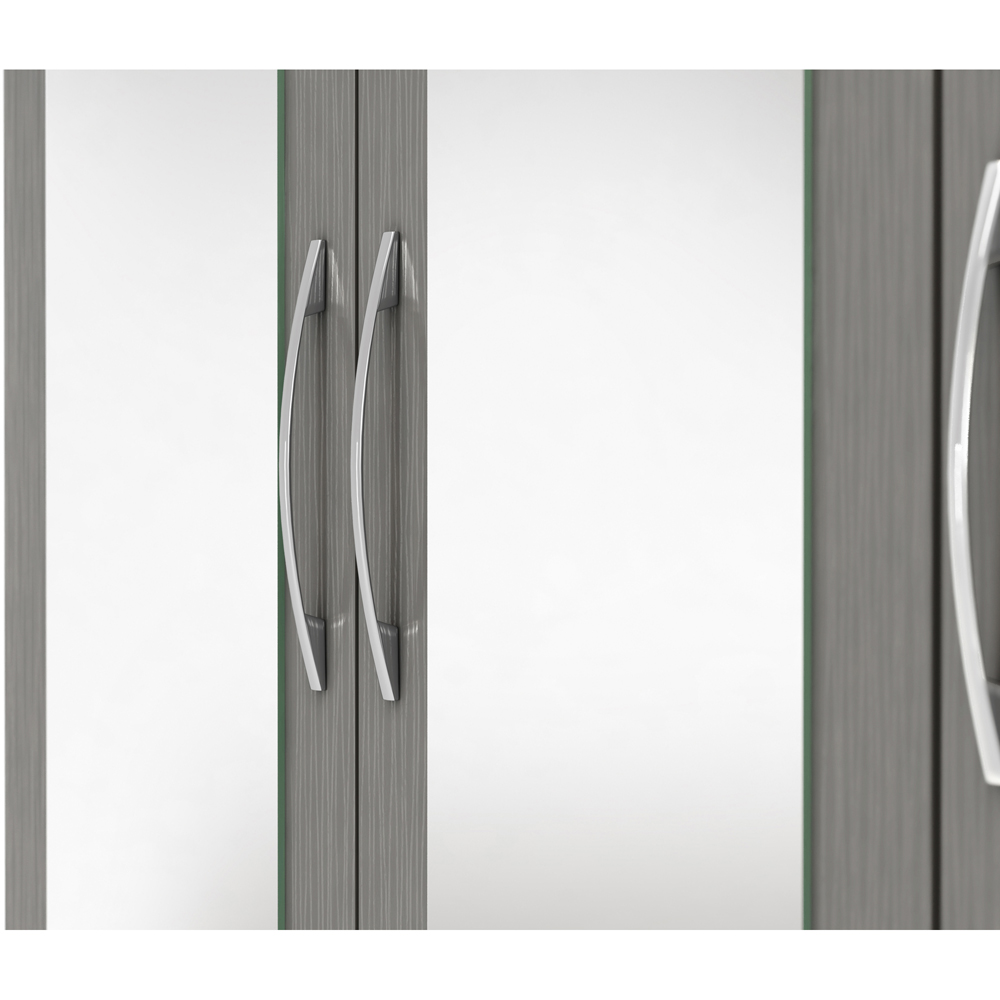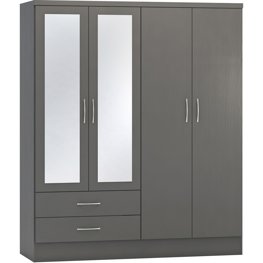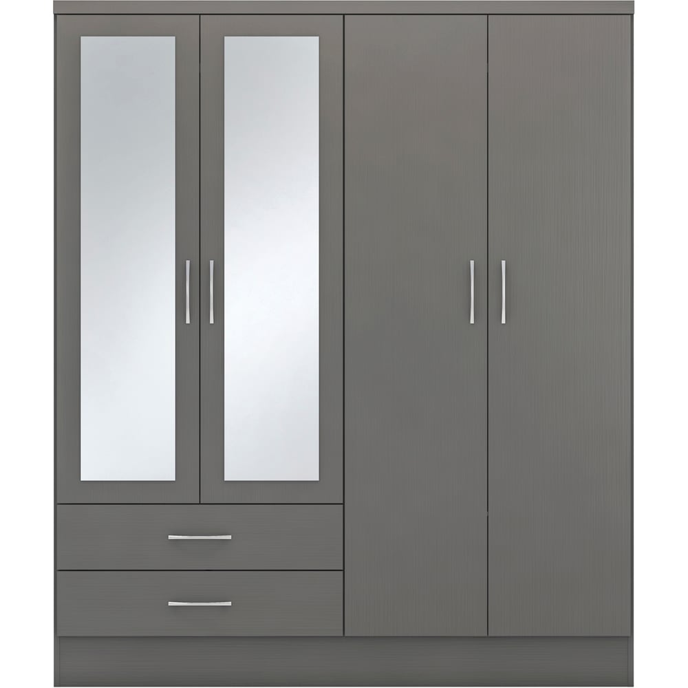 Unlock your style potential with this Seconique Nevada 4 Door 2 Drawer 3D Effect Grey Mirror Wardrobe, a spacious and stylish storage solution for your bedroom. With its contemporary design, this wardrobe features four doors that open to reveal ample space for hanging clothes, while two drawers at the bottom offer additional storage for accessories. The wardrobe's sleek and modern aesthetic is complemented by its practical layout, making it a functional and attractive piece of furniture. Whether you need to organize your clothing collection or enhance the look of your bedroom, the wardrobe provides a versatile and chic solution to meet your storage needs.
