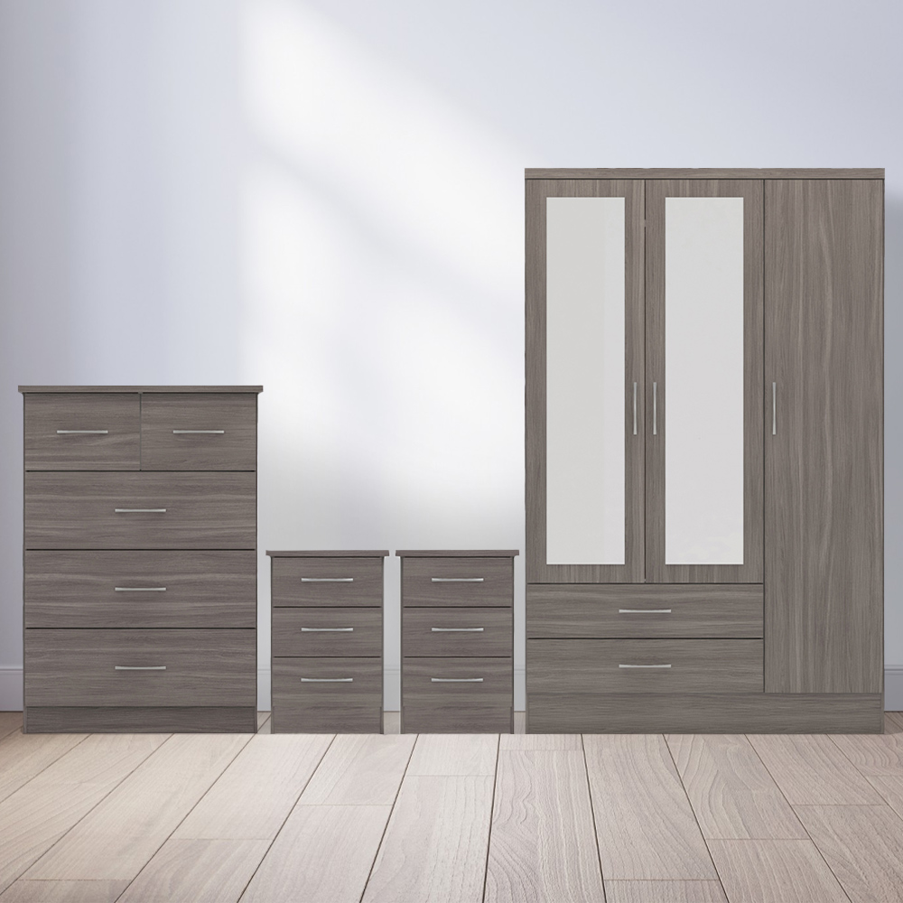 Enhance your home decor and make it more functional with the Seconique Nevada Four Piece Bedroom Set. This black wood grain set has a subtle design with sleek handles for easy accessibility. It includes a three-door wardrobe with two drawers, two identical bedside tables with three drawers each and a three plus two-drawer storage chest. This set provides ample storage space for your clothing and accessories. This set is exquisitely crafted to exude a cohesive look that will complement both modern and traditional interior spaces.