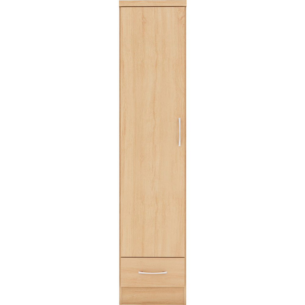 The Seconique Nevada Wardrobe is a compact and stylish storage solution for your bedroom. With one door and one drawer, this wardrobe with a large internal space provides practical storage in a sleek design. Complete with metal handles and drawer runners, it features a Sonoma oak effect finish to blend in a range of decor theme palettes.